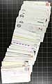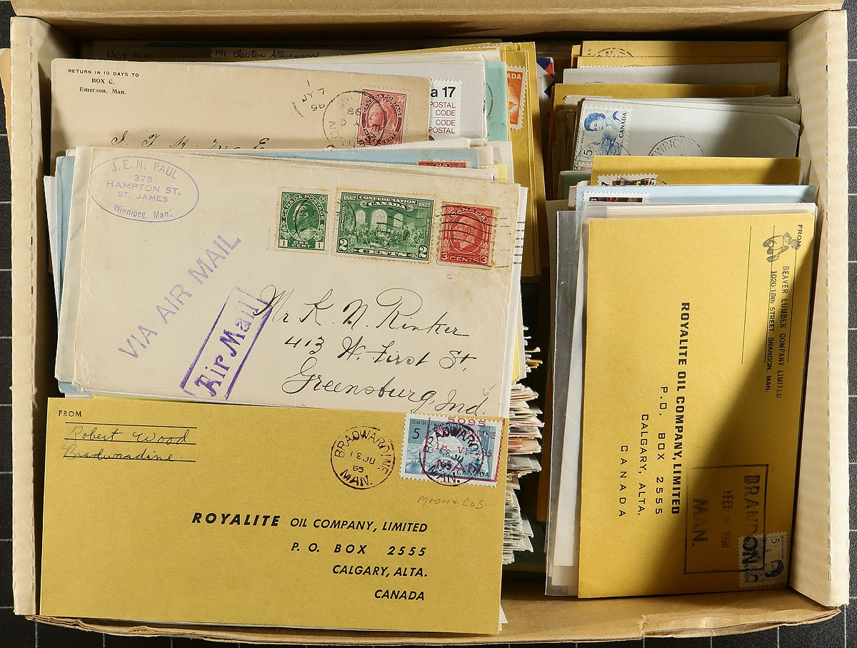 Manitoba Postal History. Accumulation of roughly 550 Manitoba covers with town postmarks filling a small box. The covers generally range from the 1940's to the 1980's, but did spot earlier material, noting a wide variety of postmarks including MOTO, MOON, POCON, cds, split ring, and more, representing a few hundred different tons, including a few corner advertising covers. Some of the covers are #10 in size, with a few faults with a few of the covers. A nice lot for the Manitoba or Canada postmark collector. Estimate =