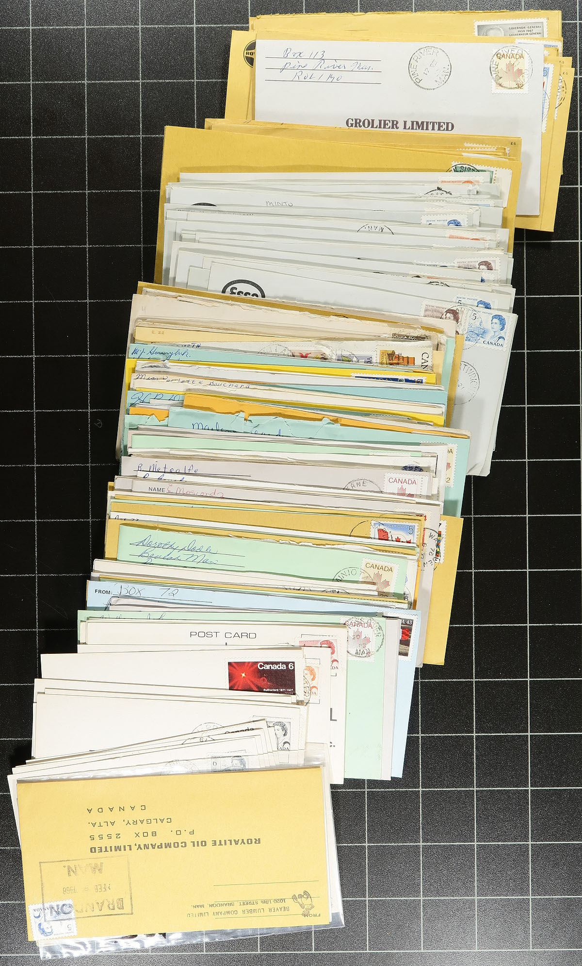 Manitoba Postal History. Accumulation of roughly 550 Manitoba covers with town postmarks filling a small box. The covers generally range from the 1940's to the 1980's, but did spot earlier material, noting a wide variety of postmarks including MOTO, MOON, POCON, cds, split ring, and more, representing a few hundred different tons, including a few corner advertising covers. Some of the covers are #10 in size, with a few faults with a few of the covers. A nice lot for the Manitoba or Canada postmark collector. Estimate =
