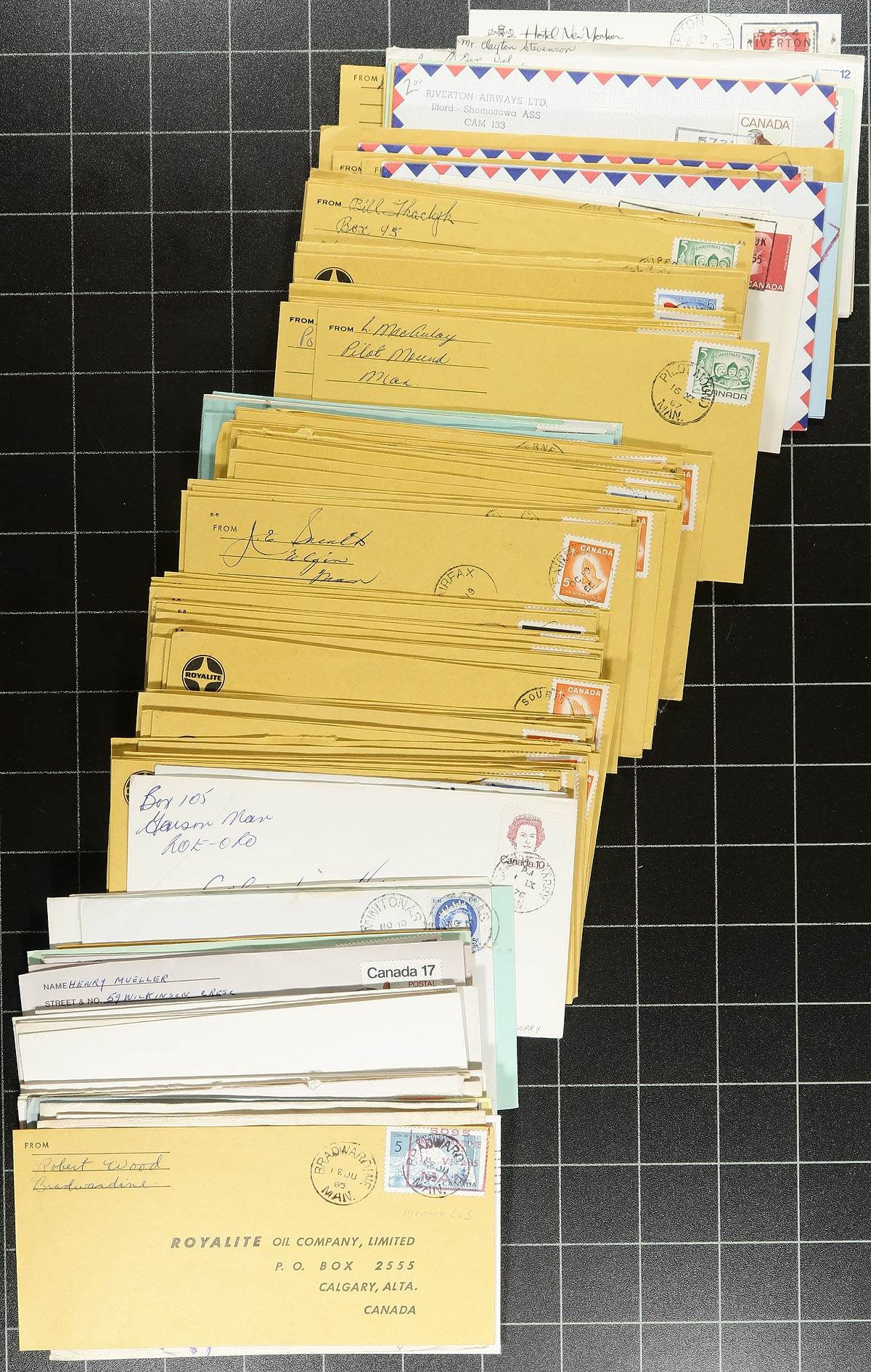 Manitoba Postal History. Accumulation of roughly 550 Manitoba covers with town postmarks filling a small box. The covers generally range from the 1940's to the 1980's, but did spot earlier material, noting a wide variety of postmarks including MOTO, MOON, POCON, cds, split ring, and more, representing a few hundred different tons, including a few corner advertising covers. Some of the covers are #10 in size, with a few faults with a few of the covers. A nice lot for the Manitoba or Canada postmark collector. Estimate =