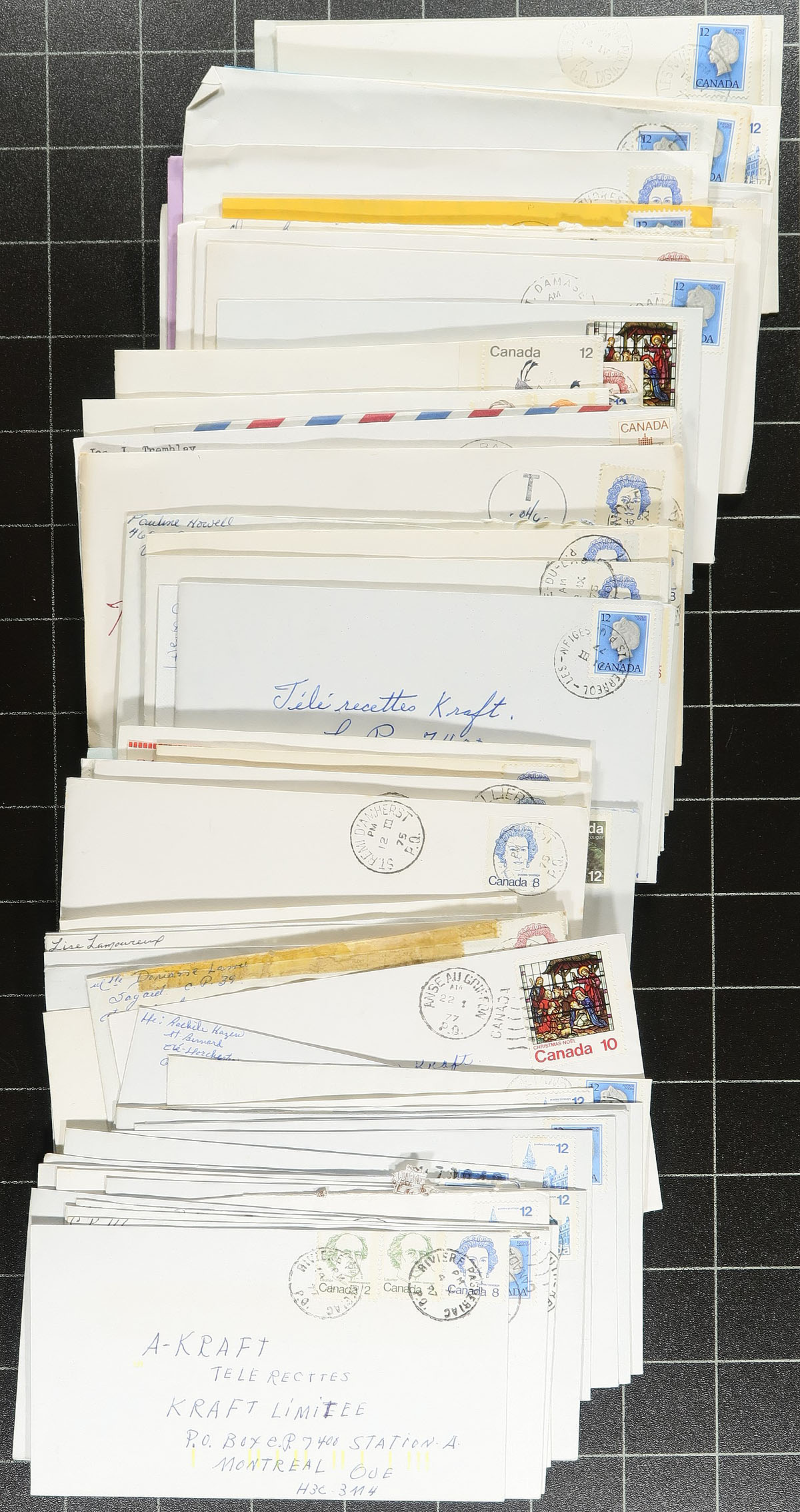 Quebec Postmarks. Accumulation of roughly 700 Quebec covers with town postmarks in a carton. The covers generally range from the 1950's to the 1990's, but did spot earlier material, noting a good range of postmarks including POCON, Klussendorf, a few flags, cds, duplex, and more, representing a few hundred different towns, including corner advertising covers, post cards, stationery, and roughly 40 change of address cards. A nice lot for the Quebec or Canada postmark collector. Estimate =