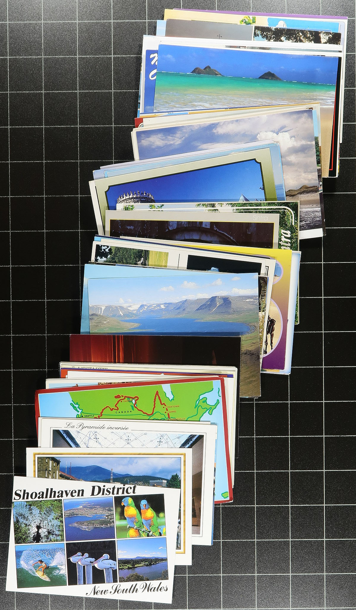 Accumulation of roughly 1,250 worldwide postcards stuffing a bankers box. The lot consists of chrome postcards, with a few other types possible, covering regions of Canada, Europe, Asia, and other areas, with a wide range of topics present including nature scenes, buildings, ships, buildings, famous city locations, and much more. Generally clean overall. Estimate =