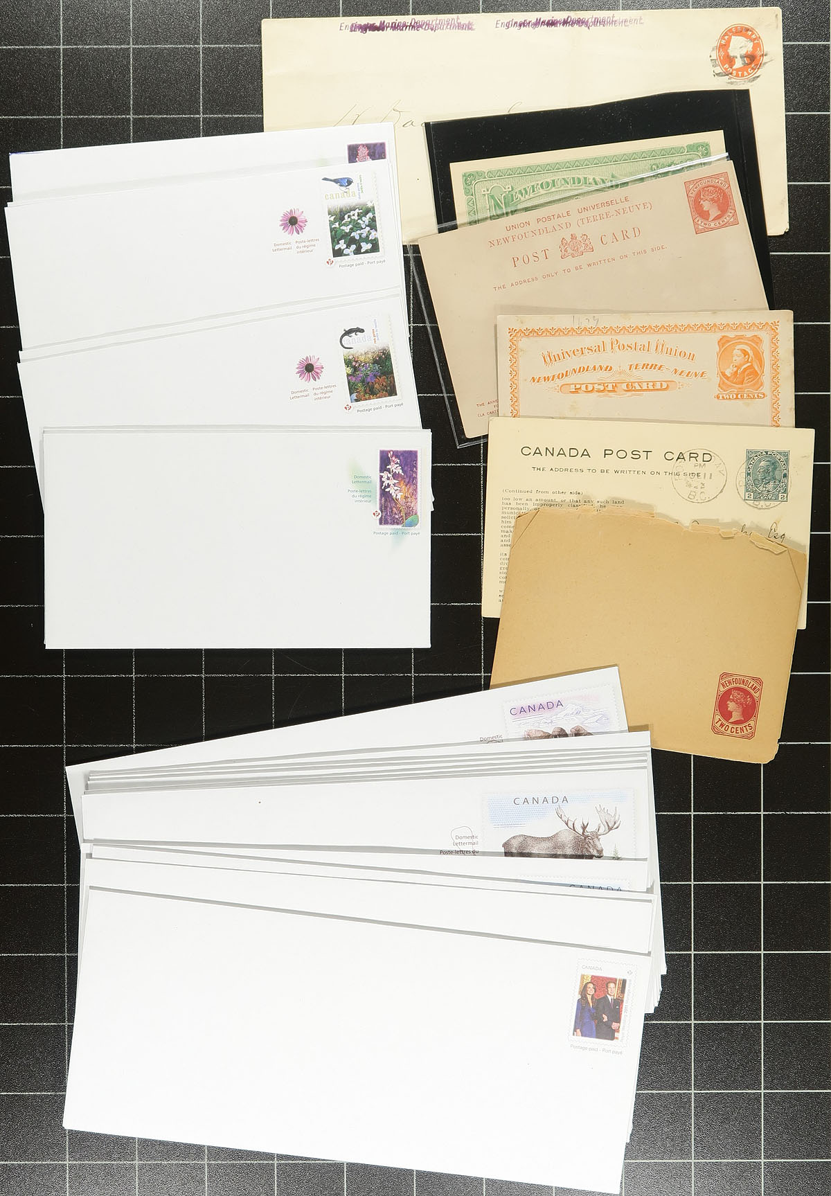 Postal Stationery. Accumulation of several hundred mint and used Canada postal stationery material in a bankers box. We note a wide variety of material (mostly unused), from the Victorian era up to the 2000's, noting postage paid cards, postal cards, wrappers, reply cards, letter cards, UPU cards, a few Newfoundland pieces, air letters, and much more, noting Star Trek postage paid cards, Wildlife envelopes, etc. Duplication heavy for some issues, with many items cataloguing in the $2 to $5 and up range. A nice lot for the specialist. Estimate =