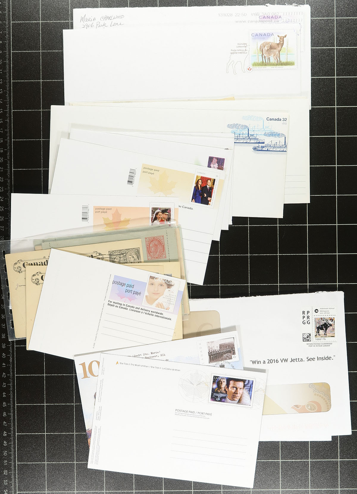 Postal Stationery. Accumulation of several hundred mint and used Canada postal stationery material in a bankers box. We note a wide variety of material (mostly unused), from the Victorian era up to the 2000's, noting postage paid cards, postal cards, wrappers, reply cards, letter cards, UPU cards, a few Newfoundland pieces, air letters, and much more, noting Star Trek postage paid cards, Wildlife envelopes, etc. Duplication heavy for some issues, with many items cataloguing in the $2 to $5 and up range. A nice lot for the specialist. Estimate =