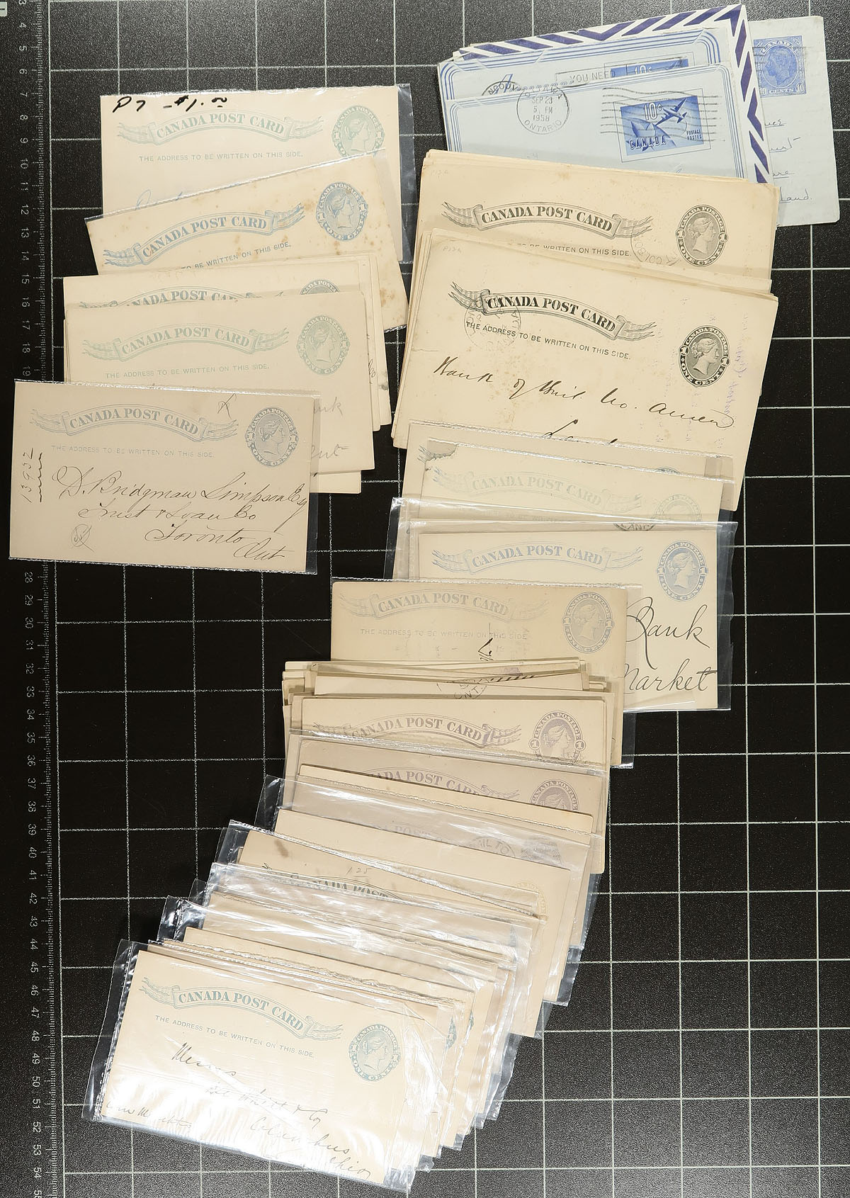 Postal Stationery. Accumulation of several hundred mint and used Canada postal stationery material in a bankers box. We note a wide variety of material (mostly unused), from the Victorian era up to the 2000's, noting postage paid cards, postal cards, wrappers, reply cards, letter cards, UPU cards, a few Newfoundland pieces, air letters, and much more, noting Star Trek postage paid cards, Wildlife envelopes, etc. Duplication heavy for some issues, with many items cataloguing in the $2 to $5 and up range. A nice lot for the specialist. Estimate =