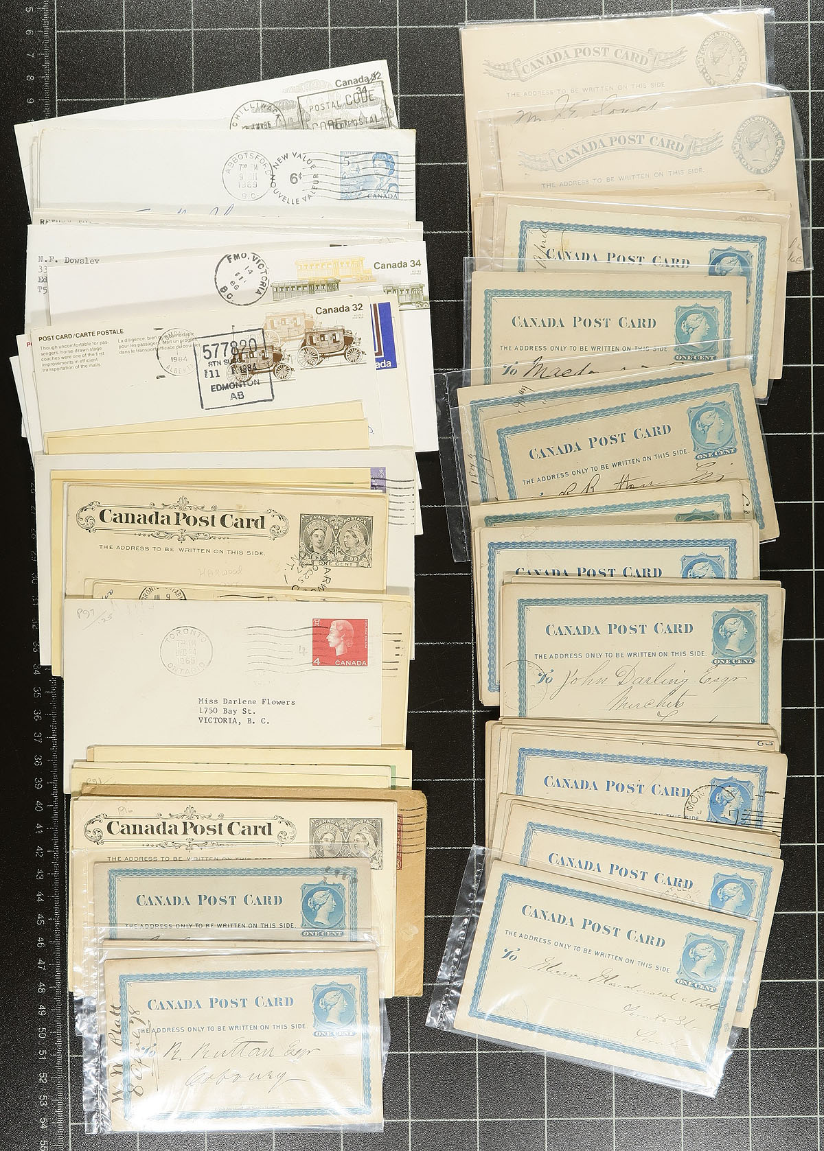 Postal Stationery. Accumulation of several hundred mint and used Canada postal stationery material in a bankers box. We note a wide variety of material (mostly unused), from the Victorian era up to the 2000's, noting postage paid cards, postal cards, wrappers, reply cards, letter cards, UPU cards, a few Newfoundland pieces, air letters, and much more, noting Star Trek postage paid cards, Wildlife envelopes, etc. Duplication heavy for some issues, with many items cataloguing in the $2 to $5 and up range. A nice lot for the specialist. Estimate =