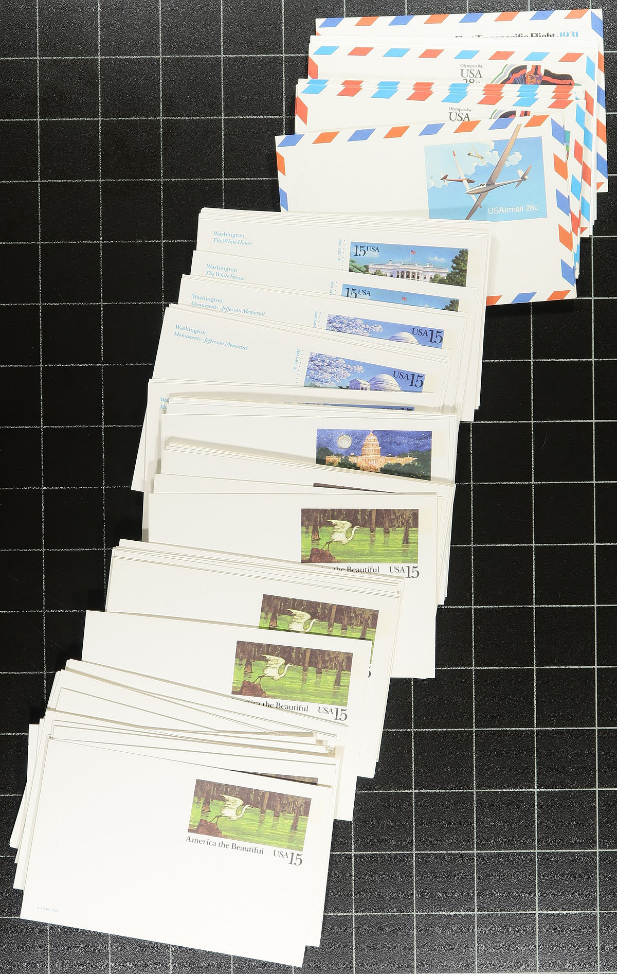 Postal Stationery. Accumulation of roughly 300 unused United States postal stationery covers and cards filling a box. The majority of material is from the 1980's to the 1990's, notably postal cards and various sized envelopes. We estimate the face value to be in the $100 range, along with a few used items included as well. Much duplication for some of the issues, overall a very clean lot. Estimate =