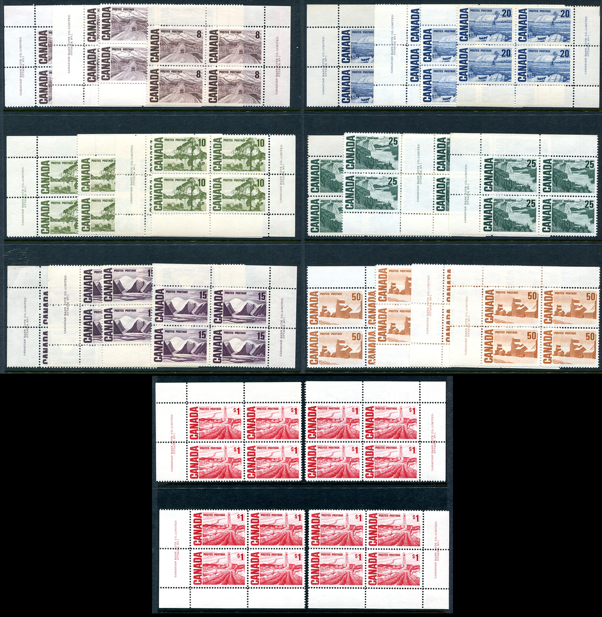 Complete set of mint Never Hinged matched set of Plate #1 plate blocks (all four corners for each value) of the 1967 issued Mid/High value Centennial series with DEX gum. A tidy complete run. Unchecked for better fluorescence. 2024 Unitrade =