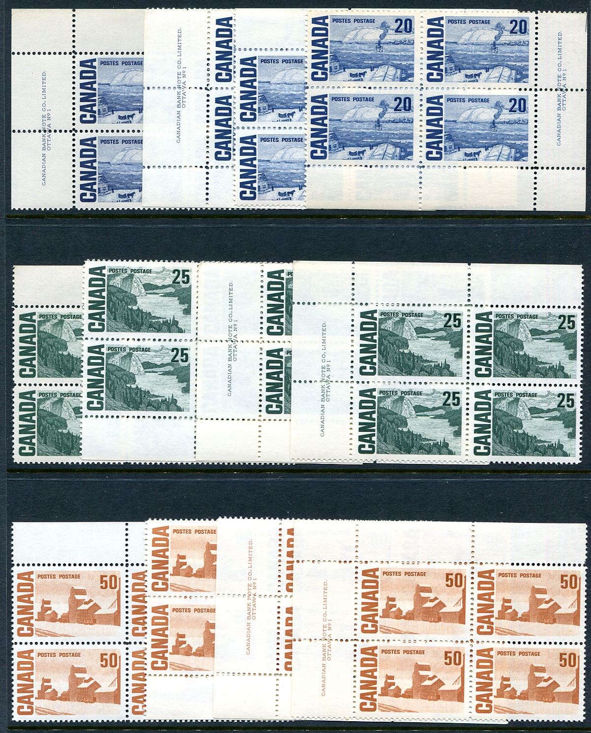 Complete set of mint Never Hinged matched set of Plate #1 plate blocks (all four corners for each value) of the 1967 issued Mid/High value Centennial series with DEX gum. A tidy complete run. Unchecked for better fluorescence. 2024 Unitrade =