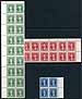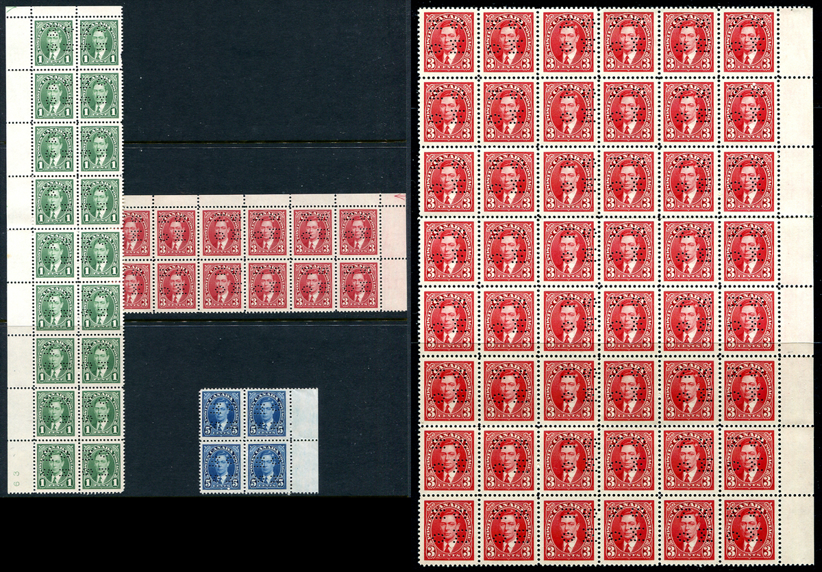 VF mint Never Hinged " position multiples" of the George VI Mufti series, "O.H.M.S." perforated Official Stamps, including the 1c green (UL corner block of 18, position 4), 3c carmine (UR corner block of 12, right-margin block of 72, both position 2) and the 5c blue (right-margin block of 4, position 2). Large multiples are not often seen, from the family of a collector who acquired these at the time of issue. 2024 Unitrade =