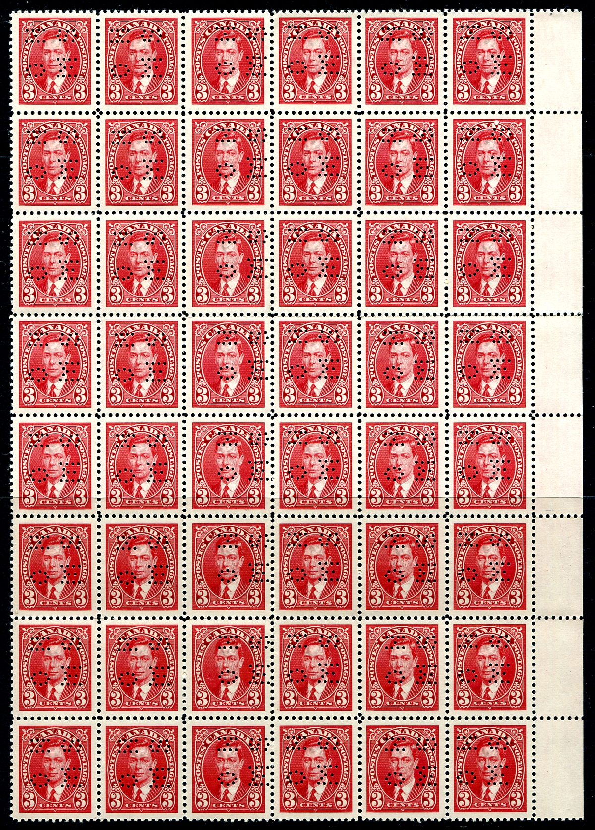 VF mint Never Hinged " position multiples" of the George VI Mufti series, "O.H.M.S." perforated Official Stamps, including the 1c green (UL corner block of 18, position 4), 3c carmine (UR corner block of 12, right-margin block of 72, both position 2) and the 5c blue (right-margin block of 4, position 2). Large multiples are not often seen, from the family of a collector who acquired these at the time of issue. 2024 Unitrade =