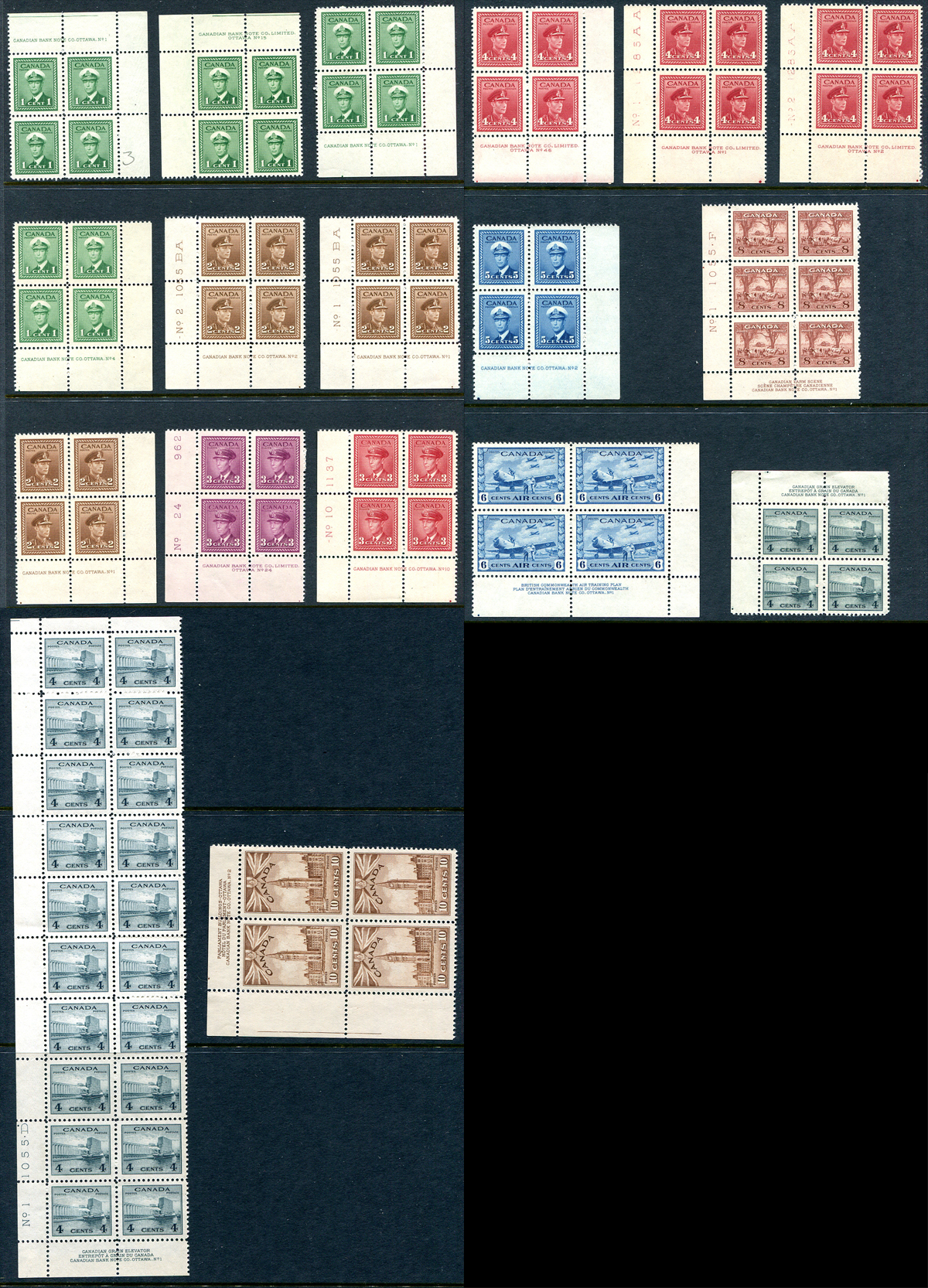 F/VF (mostly VF) mint Never Hinged selection of 18 different Plate Blocks, from the 1942-1943 George VI "War" series, including the "back of the book" airmail and an oversize (block of 20) of the 4c Grain Elevator. A nice clean lot. 2024 Unitrade =