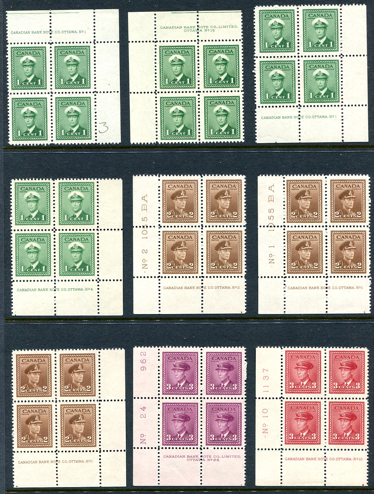 F/VF (mostly VF) mint Never Hinged selection of 18 different Plate Blocks, from the 1942-1943 George VI "War" series, including the "back of the book" airmail and an oversize (block of 20) of the 4c Grain Elevator. A nice clean lot. 2024 Unitrade =