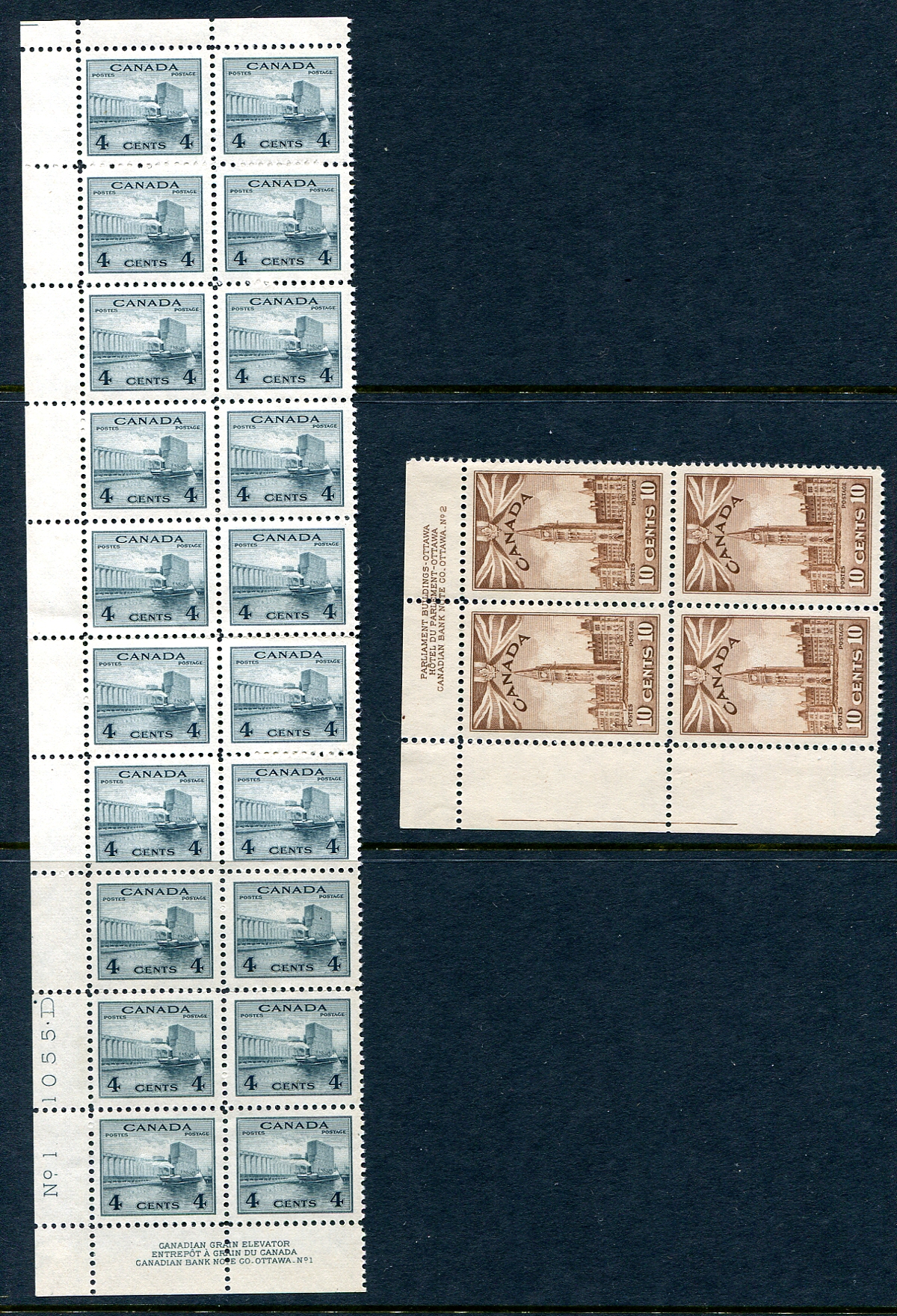 F/VF (mostly VF) mint Never Hinged selection of 18 different Plate Blocks, from the 1942-1943 George VI "War" series, including the "back of the book" airmail and an oversize (block of 20) of the 4c Grain Elevator. A nice clean lot. 2024 Unitrade =