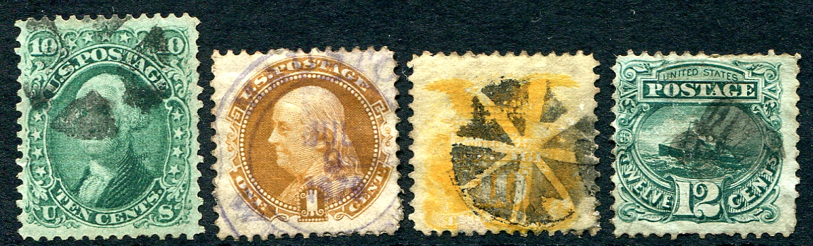 Used quartet of better 1861-1869 issued including the 10c green Washington, 1c buff Franklin, 10c yellow "Shield and Eagle" and 12c green "SS Adriatic". A couple shortish perfs noted, but overall a clean group. 2025 Scott US$450.00 =
