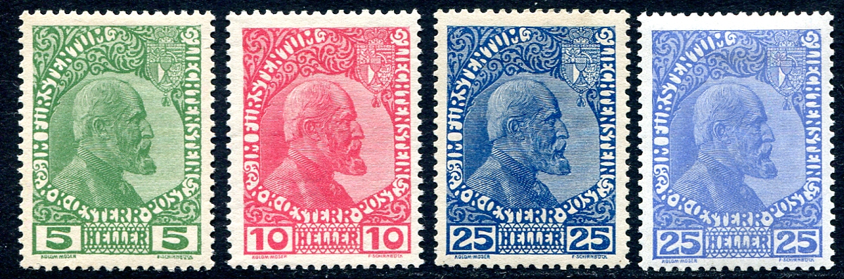 The 1915 5h yellow green, 10h rose, 25h dark blue and 25h ultramarine Prince Johan II issues on unsurfaced paper. VF mint hinge remnant. 2025 Scott US$1,049.00 =