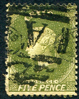 Fine used example of the 5p olive green, from the 1863-1867 Queen Victoria series. Attractive "A" barred postmark. A couple "blind" perfs LL, mentioned "for the record". 2025 Scott US$350.00 =