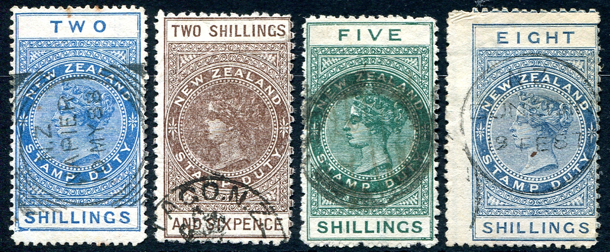 Fine used quartet of 1882 Queen Victoria Postal Fiscal stamps, including the 2sh blue, 2sh6p dark brown, 5sh green and 8sh dull blue. 2025 Scott US$205.00 =