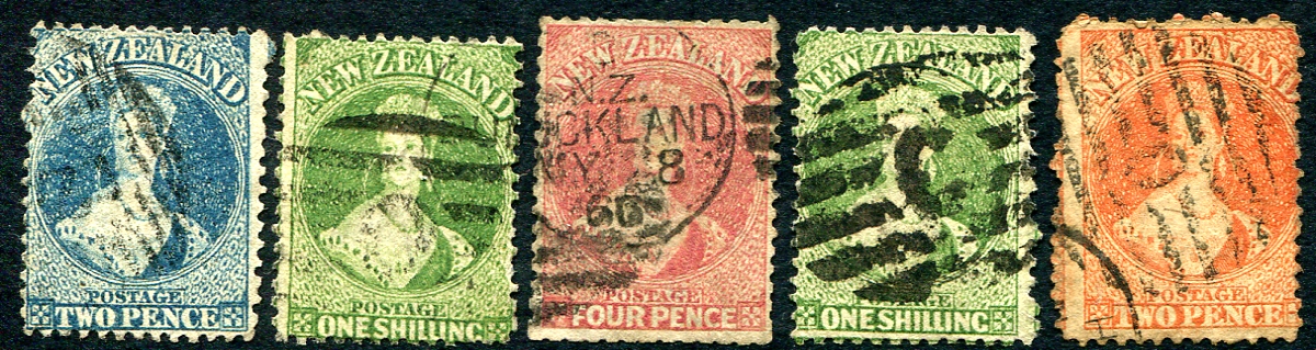 Used quintet of 1863-1872 perforated QV "Chalons" including the 1863 issued 2p blue, 1863 issued 1sh green, 1865 issued 4p deep rose, 1864-1871 issued 1sh green and 1872 issued 2p vermilion. A few minor perf faults, as usually seen on these early perforated issues, but overall fine. 2025 Scott US$1625.00 =