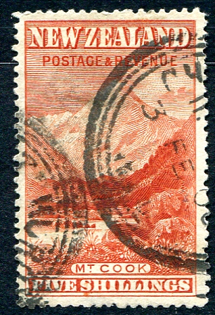 Used example of the 1898 issue 5 shilling vermilion "Mount Cook" high value, perf 15 x 15. Very well centered and nicely postmarked. 2025 Scott US$525.00 =
