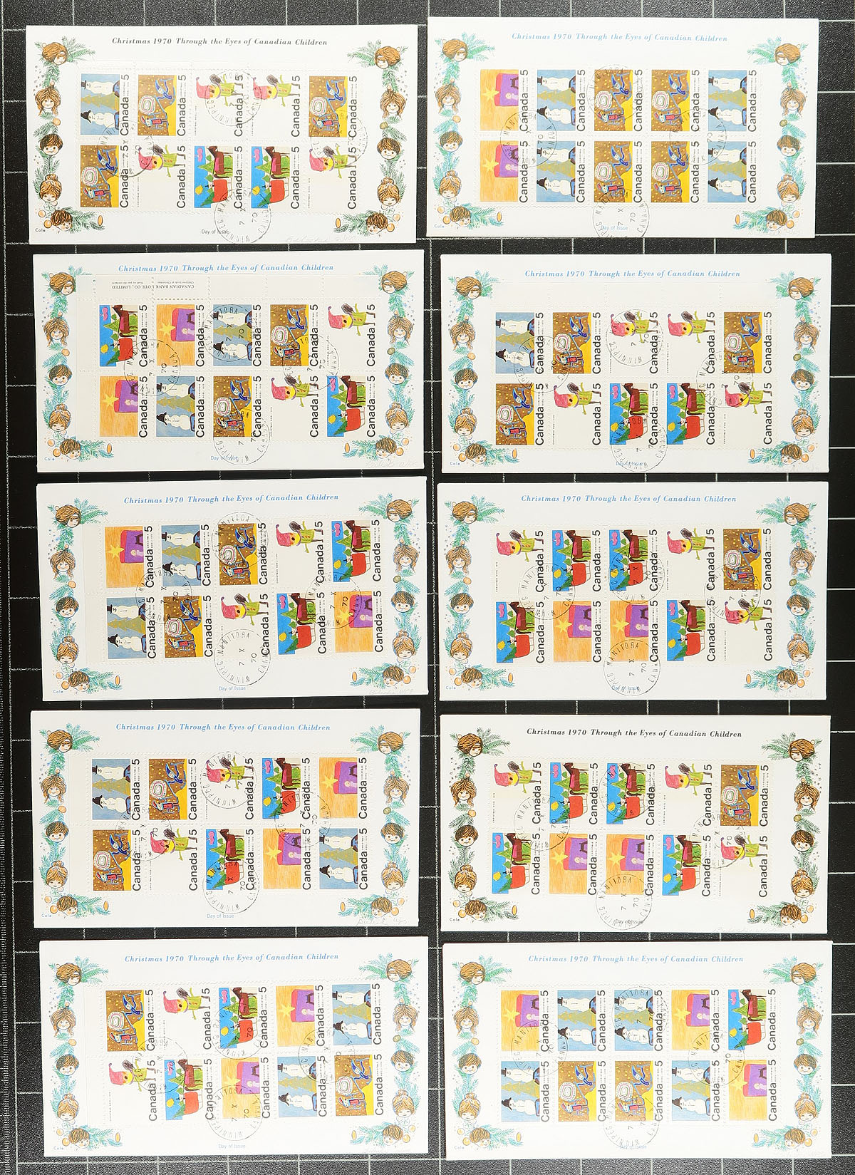 Attractive and all different lot of 1970 issue 5c Xmas Children's drawings, all in blocks of ten on 27 interestingly cacheted FDCs. Includes se-tenant identical pairs and one identical centre block of four (untagged). Owner's valuation / catalogue value from 10+ years ago was $467.00. Estimate =
