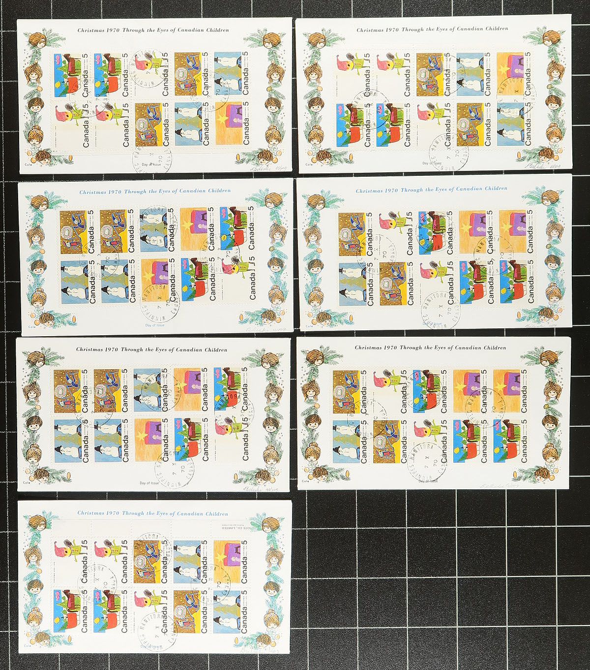 Attractive and all different lot of 1970 issue 5c Xmas Children's drawings, all in blocks of ten on 27 interestingly cacheted FDCs. Includes se-tenant identical pairs and one identical centre block of four (untagged). Owner's valuation / catalogue value from 10+ years ago was $467.00. Estimate =