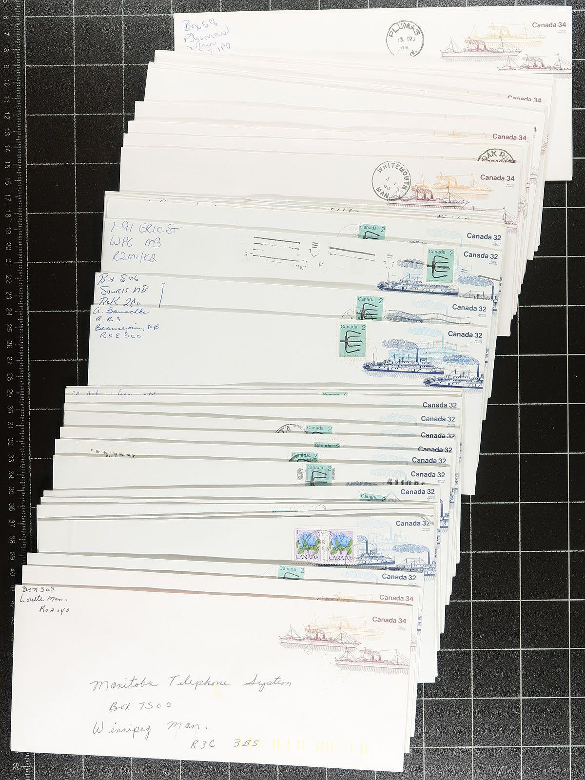 Manitoba Postal History / Postal Stationery. Group of roughly 230 postal stationery covers with Manitoba town postmarks, from years 1985-1986, paying first class domestic rates (including a few uprated covers). We note a variety of postmarks including cds, duplex, slogan, POCON types, Klussendorf, representing roughly 75 different towns including Grand Rapids, Pilot Mound, Moosehorn, Clearwater, Strathclair, Seven Sisters Falls, and more. Duplication up to 3 for a few towns, overall fine to very fine. Estimate =