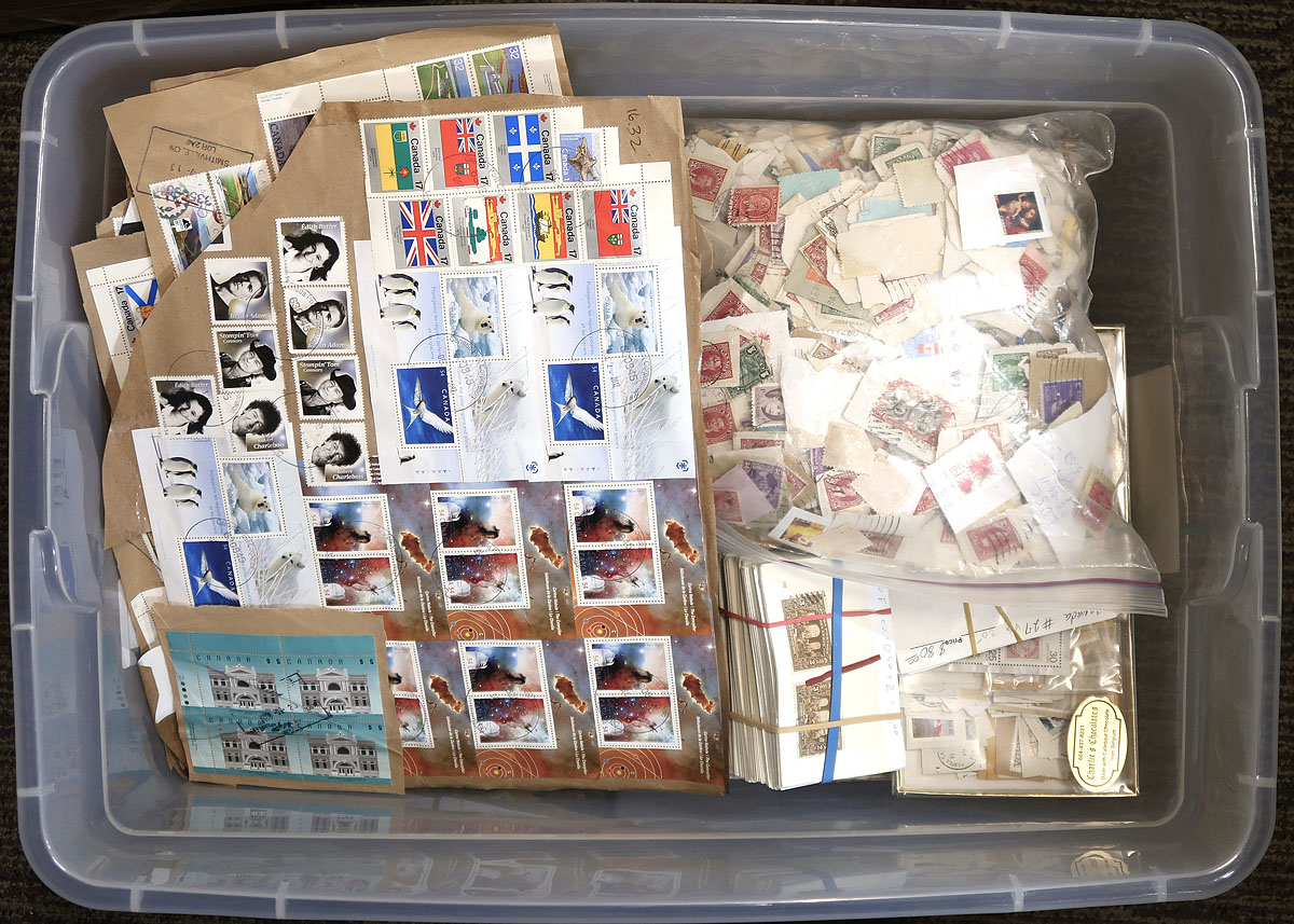 Large mystery bin of used Canada, containing thousands and thousands of used stamps in a variety of formats, on and off paper, in boxes, bags, tins, 102 cards, from parcels, etc. The majority of material appears to be from the 1900's to modern "P" values, but note some Victorian stamps, modern souvenir sheets, and more. A nice lot for the postmark hunter as we saw town cancels, RPOs, and probably much more to be hunted down. A nice project for the used collector. Estimate =