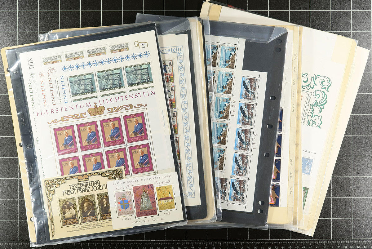 Collection / Accumulation of primarily never hinged Liechtenstein sheets, 1938-2000, with roughly 120 sheets or souvenir sheets, in several manila or Vario-style stock pages. The group has better representation from the 1960's to the 1980's, with some sheets cataloguing $5 to $30 and up each, including Scott #159 (lh, c.v. $90), leaving finds to the dedicated collector. Owner's Scott 2020 catalogue value for the collection totals $1,704. Duplication is up to 2-3 for some sheets. A nice grouping not often offered in this quantity, overall fine to very fine. 2024 Scott US$1,704.00 =