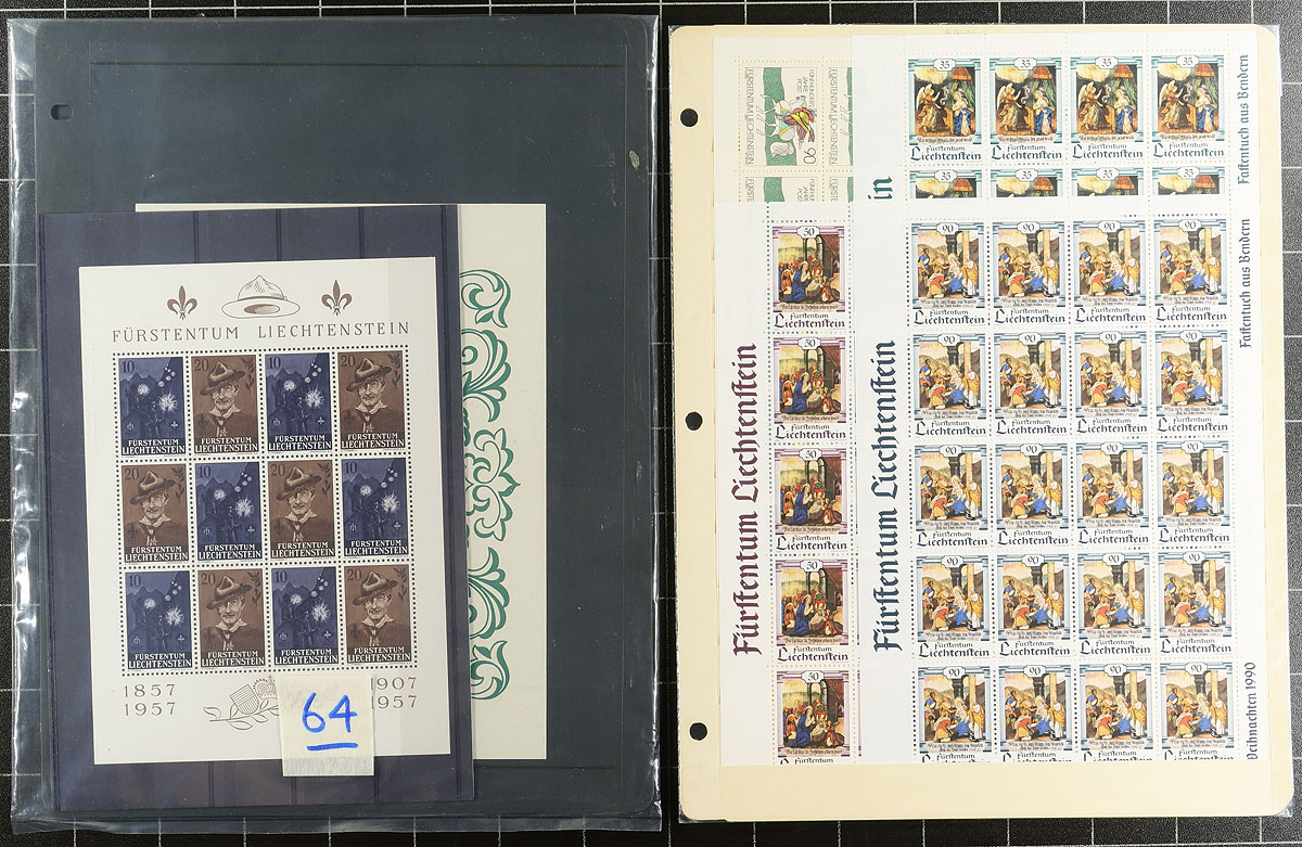 Collection / Accumulation of primarily never hinged Liechtenstein sheets, 1938-2000, with roughly 120 sheets or souvenir sheets, in several manila or Vario-style stock pages. The group has better representation from the 1960's to the 1980's, with some sheets cataloguing $5 to $30 and up each, including Scott #159 (lh, c.v. $90), leaving finds to the dedicated collector. Owner's Scott 2020 catalogue value for the collection totals $1,704. Duplication is up to 2-3 for some sheets. A nice grouping not often offered in this quantity, overall fine to very fine. 2024 Scott US$1,704.00 =