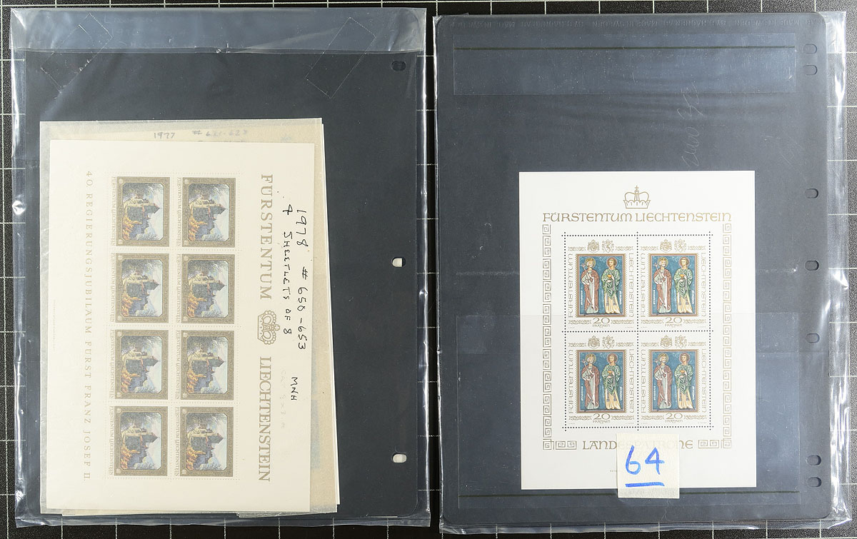Collection / Accumulation of primarily never hinged Liechtenstein sheets, 1938-2000, with roughly 120 sheets or souvenir sheets, in several manila or Vario-style stock pages. The group has better representation from the 1960's to the 1980's, with some sheets cataloguing $5 to $30 and up each, including Scott #159 (lh, c.v. $90), leaving finds to the dedicated collector. Owner's Scott 2020 catalogue value for the collection totals $1,704. Duplication is up to 2-3 for some sheets. A nice grouping not often offered in this quantity, overall fine to very fine. 2024 Scott US$1,704.00 =