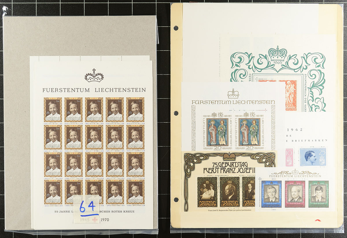 Collection / Accumulation of primarily never hinged Liechtenstein sheets, 1938-2000, with roughly 120 sheets or souvenir sheets, in several manila or Vario-style stock pages. The group has better representation from the 1960's to the 1980's, with some sheets cataloguing $5 to $30 and up each, including Scott #159 (lh, c.v. $90), leaving finds to the dedicated collector. Owner's Scott 2020 catalogue value for the collection totals $1,704. Duplication is up to 2-3 for some sheets. A nice grouping not often offered in this quantity, overall fine to very fine. 2024 Scott US$1,704.00 =