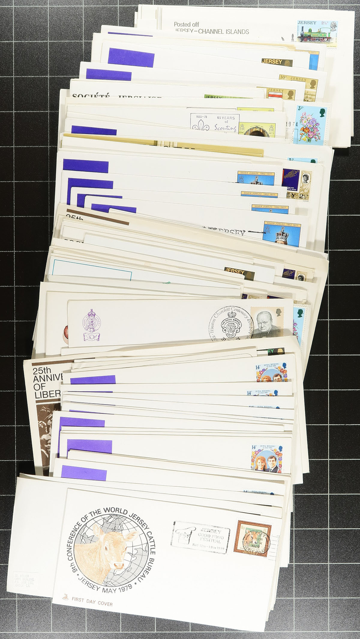 Channel Islands (Jersey) Covers. Accumulation of roughly 2,500 Jersey covers filling a bankers box, 1969-1989, mostly unaddressed envelopes collected for special slogan and commemorative postmarks. The owner's inventory lists 78 different types in varying quantities. A nice lot for the Channel Islands cancel/cover collector, and our low estimate is under 10c a cover. Estimate =