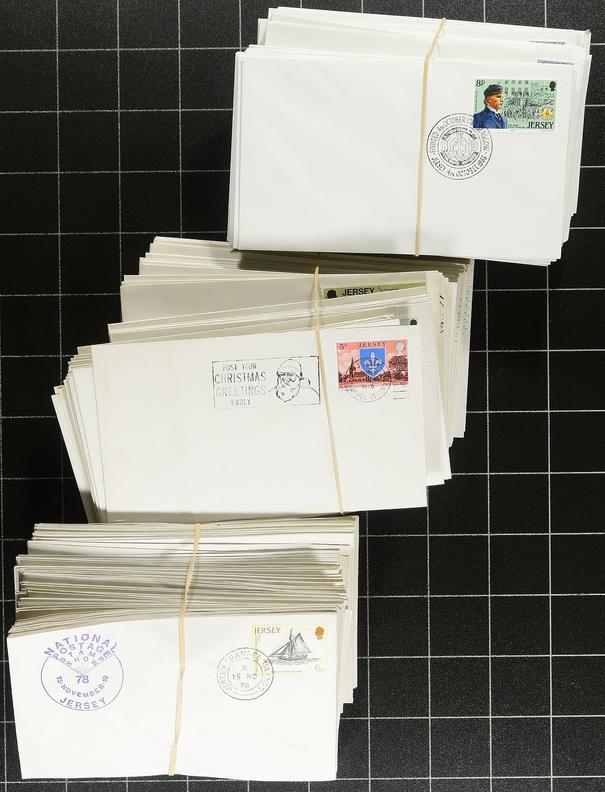 Channel Islands (Jersey) Covers. Accumulation of roughly 2,500 Jersey covers filling a bankers box, 1969-1989, mostly unaddressed envelopes collected for special slogan and commemorative postmarks. The owner's inventory lists 78 different types in varying quantities. A nice lot for the Channel Islands cancel/cover collector, and our low estimate is under 10c a cover. Estimate =