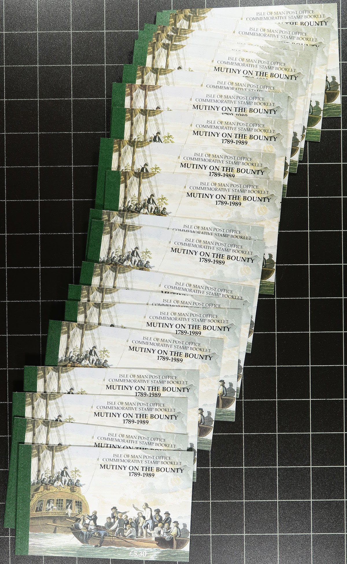 Group of 86 mint Isle of Man booklets, 1986-1993, containing 19 different intact booklets, ranging from #SB14/SB33. Owner's older specialized catalogue value for the group totals £609.00 (2008 SG Collect Channel Islands and Isle of Man catalogue). Duplication up to 1 for most issues, and 12 to 20 for a few issues. A nice clean group for the booklet collector or dealer. Estimate =