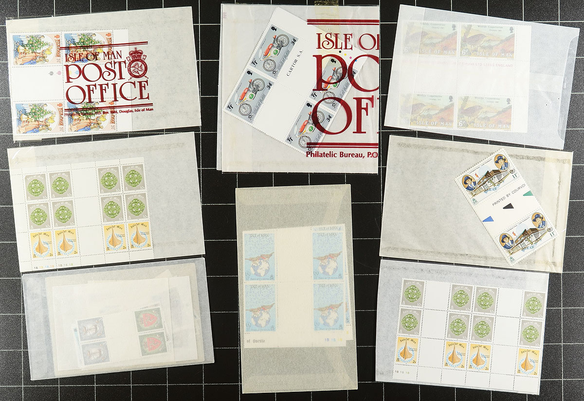 Lovely collection / accumulation of never hinged Isle of Man gutter pairs and blocks, 1973-1991, all still in the original packing from the postal services. The lot generally ranges from Scott #33/491, and includes mostly sets from the time period, noting blank and traffic light gutter blocks, along with traffic lights in the selvedge for some issues. Owner's 2013 Scott catalogue value for the lot totals $639.00 Some light duplication for some issues, still a nice clean lot for collectors and dealers alike. Estimate =