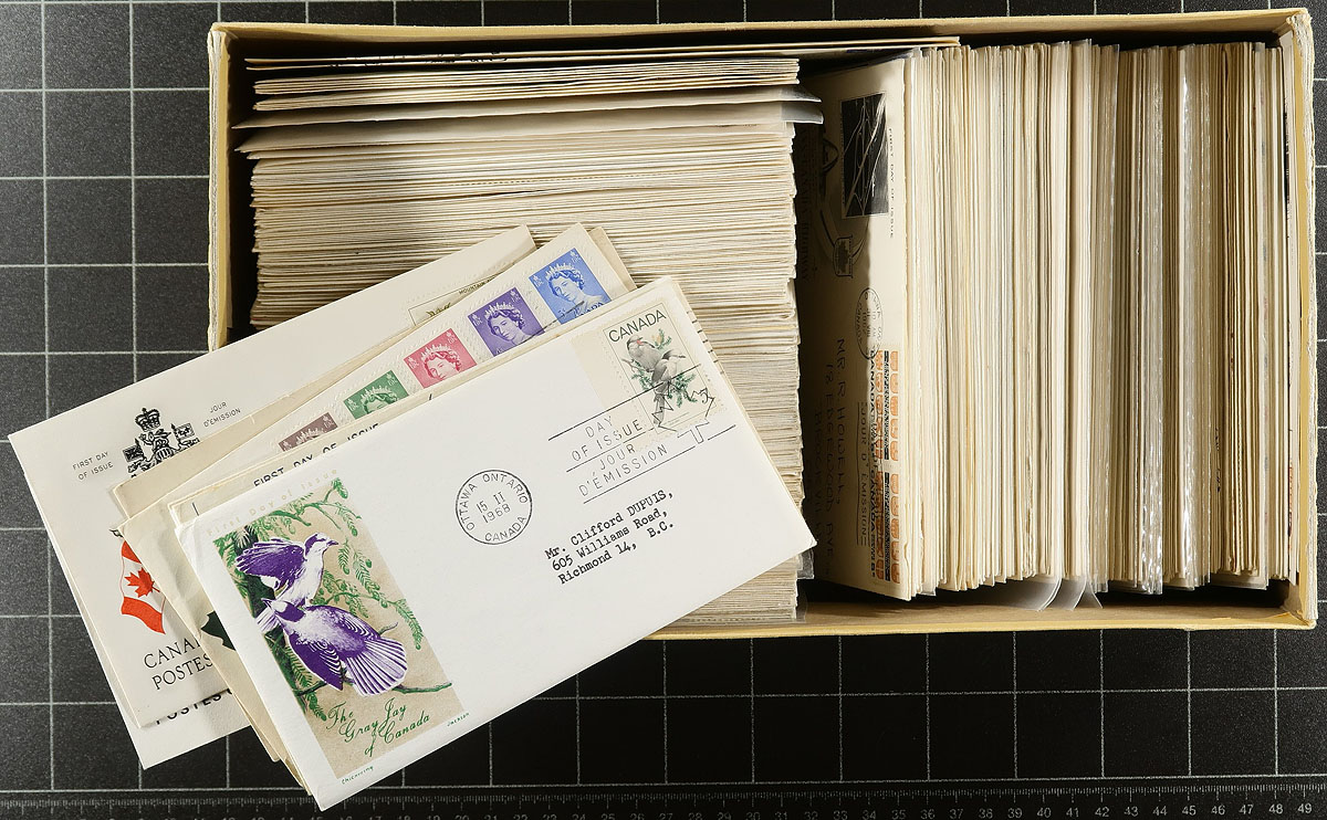 First Day Covers. Group of roughly 325 Canada first day covers, all with private cachets, 1960's-1970's, noting singles, sets, and a few block frankings. Just a few of the makers include: Cole, Chickering, Jackson, Capital, NR, Rose Craft, and perhaps a few more. Duplication up to 3 for a few issues. A nice lot for collectors or dealers. Estimate =
