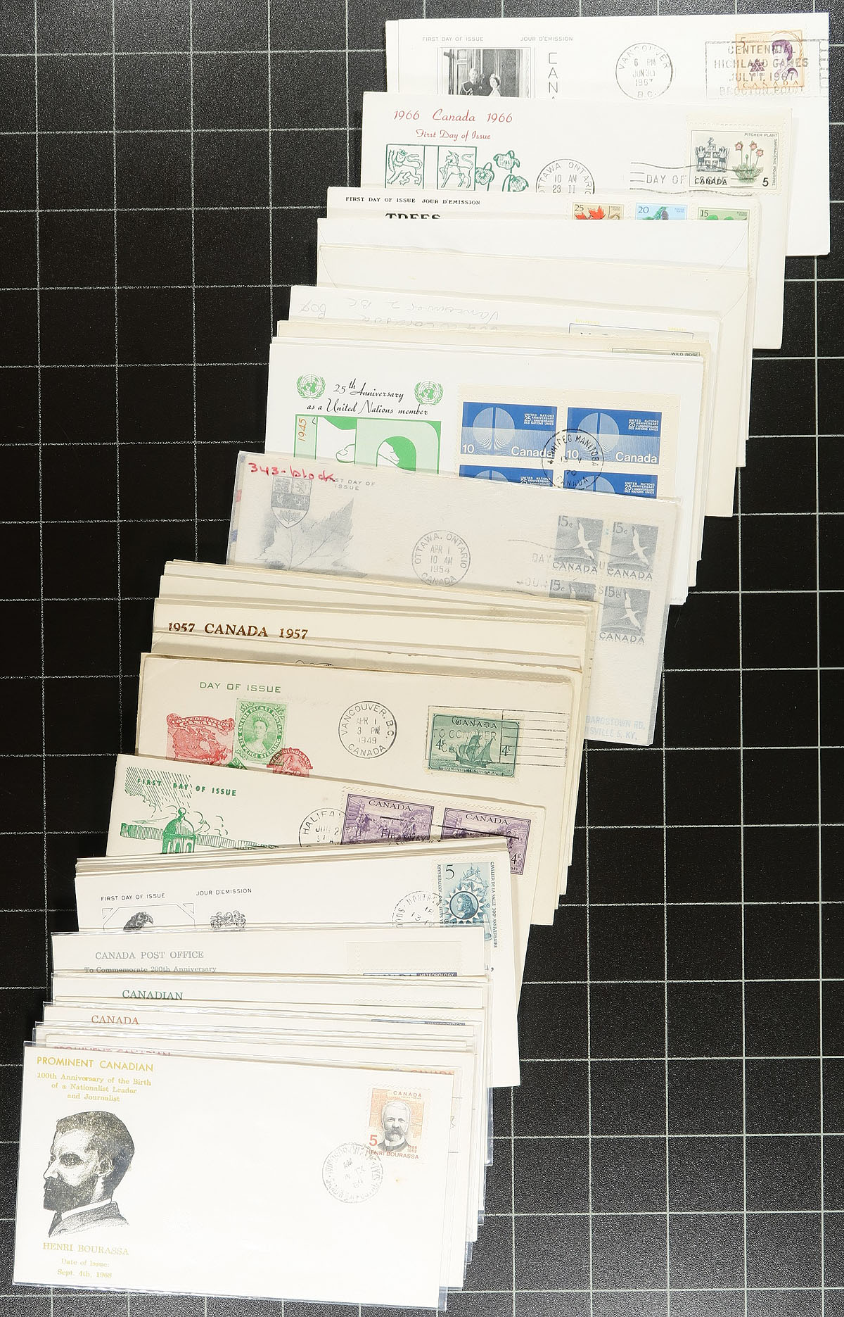 First Day Covers. Group of roughly 325 Canada first day covers, all with private cachets, 1960's-1970's, noting singles, sets, and a few block frankings. Just a few of the makers include: Cole, Chickering, Jackson, Capital, NR, Rose Craft, and perhaps a few more. Duplication up to 3 for a few issues. A nice lot for collectors or dealers. Estimate =