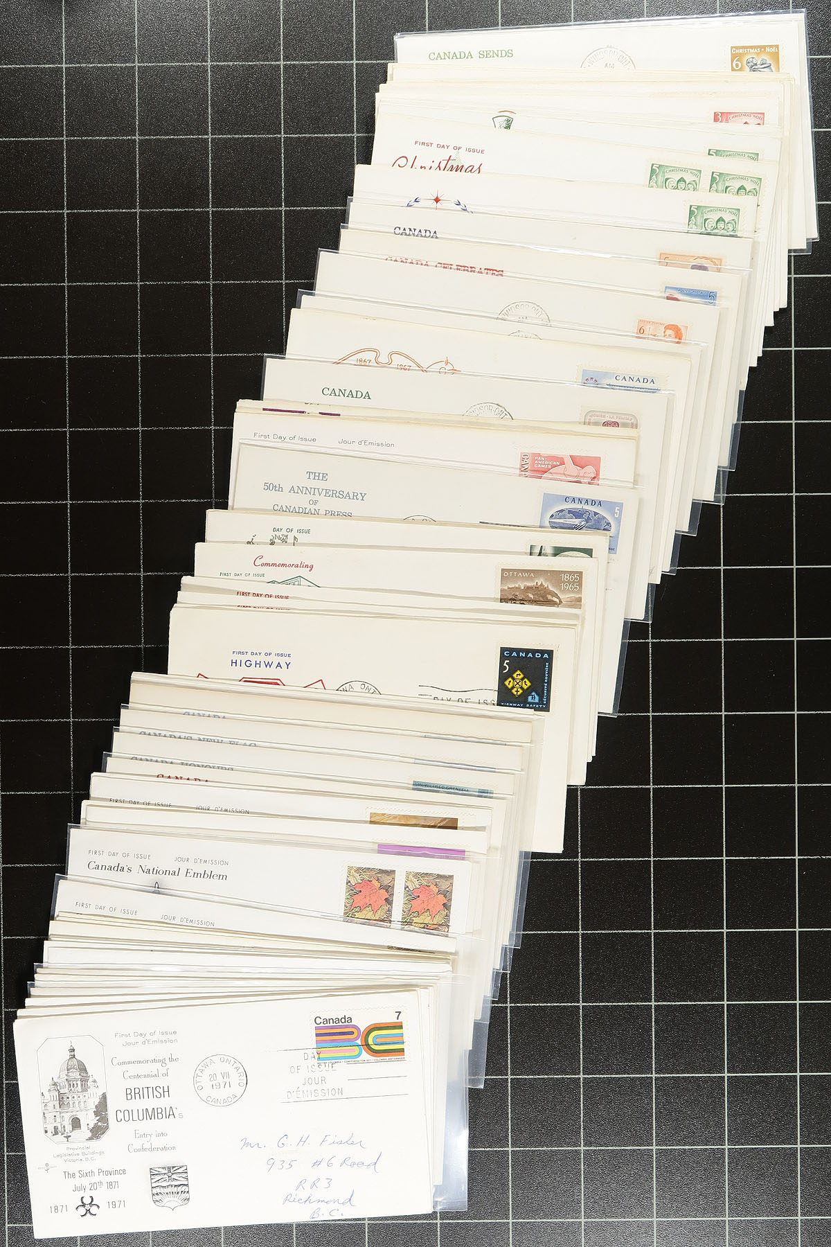 First Day Covers. Group of roughly 325 Canada first day covers, all with private cachets, 1960's-1970's, noting singles, sets, and a few block frankings. Just a few of the makers include: Cole, Chickering, Jackson, Capital, NR, Rose Craft, and perhaps a few more. Duplication up to 3 for a few issues. A nice lot for collectors or dealers. Estimate =