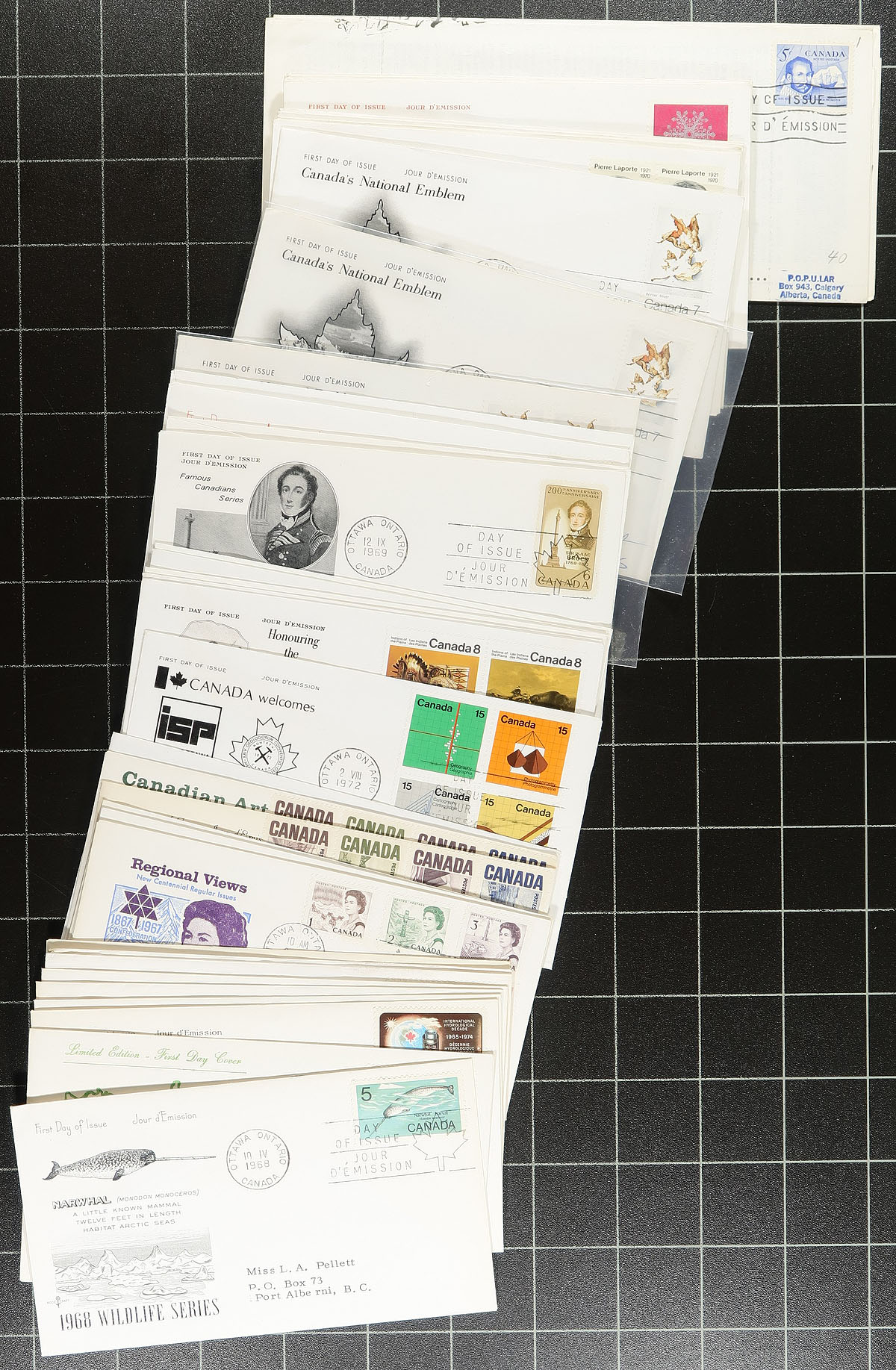 First Day Covers. Group of roughly 325 Canada first day covers, all with private cachets, 1960's-1970's, noting singles, sets, and a few block frankings. Just a few of the makers include: Cole, Chickering, Jackson, Capital, NR, Rose Craft, and perhaps a few more. Duplication up to 3 for a few issues. A nice lot for collectors or dealers. Estimate =