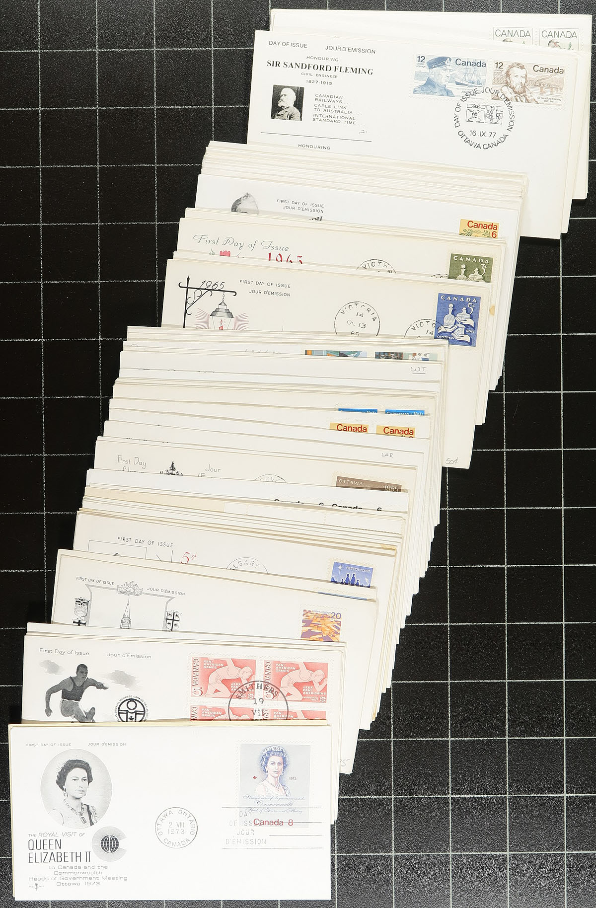 First Day Covers. Group of roughly 325 Canada first day covers, all with private cachets, 1960's-1970's, noting singles, sets, and a few block frankings. Just a few of the makers include: Cole, Chickering, Jackson, Capital, NR, Rose Craft, and perhaps a few more. Duplication up to 3 for a few issues. A nice lot for collectors or dealers. Estimate =