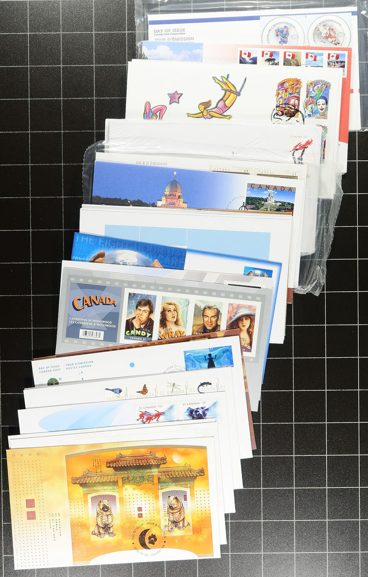 First Day Covers. Group of roughly 350 Canada first day covers, 1995-2010, with singles, sets, souvenir sheets, and plate block frankings. A nice clean group with several colorful cachets. Duplication up to 3 for a few issues. Estimate =