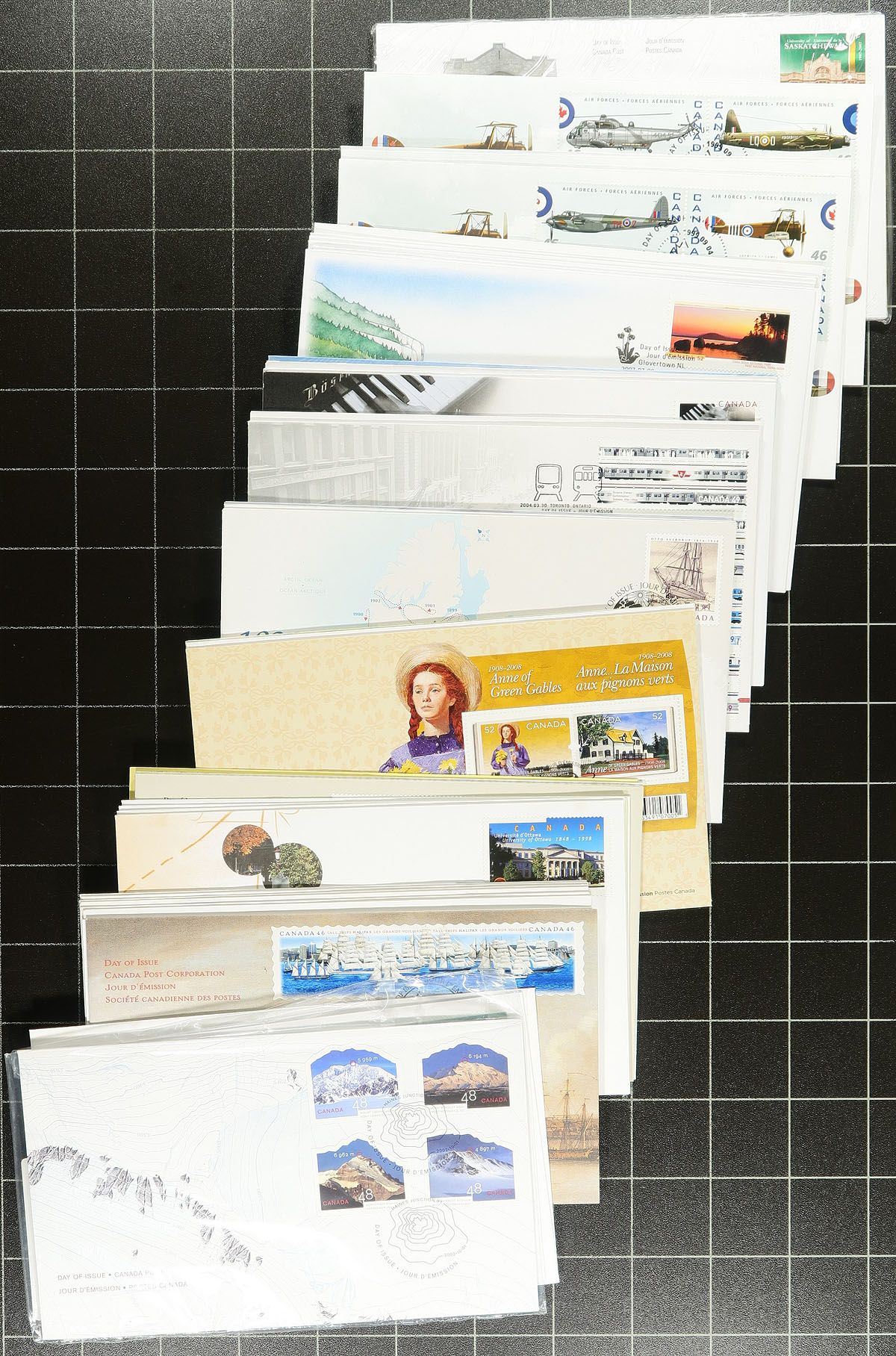 First Day Covers. Group of roughly 350 Canada first day covers, 1995-2010, with singles, sets, souvenir sheets, and plate block frankings. A nice clean group with several colorful cachets. Duplication up to 3 for a few issues. Estimate =
