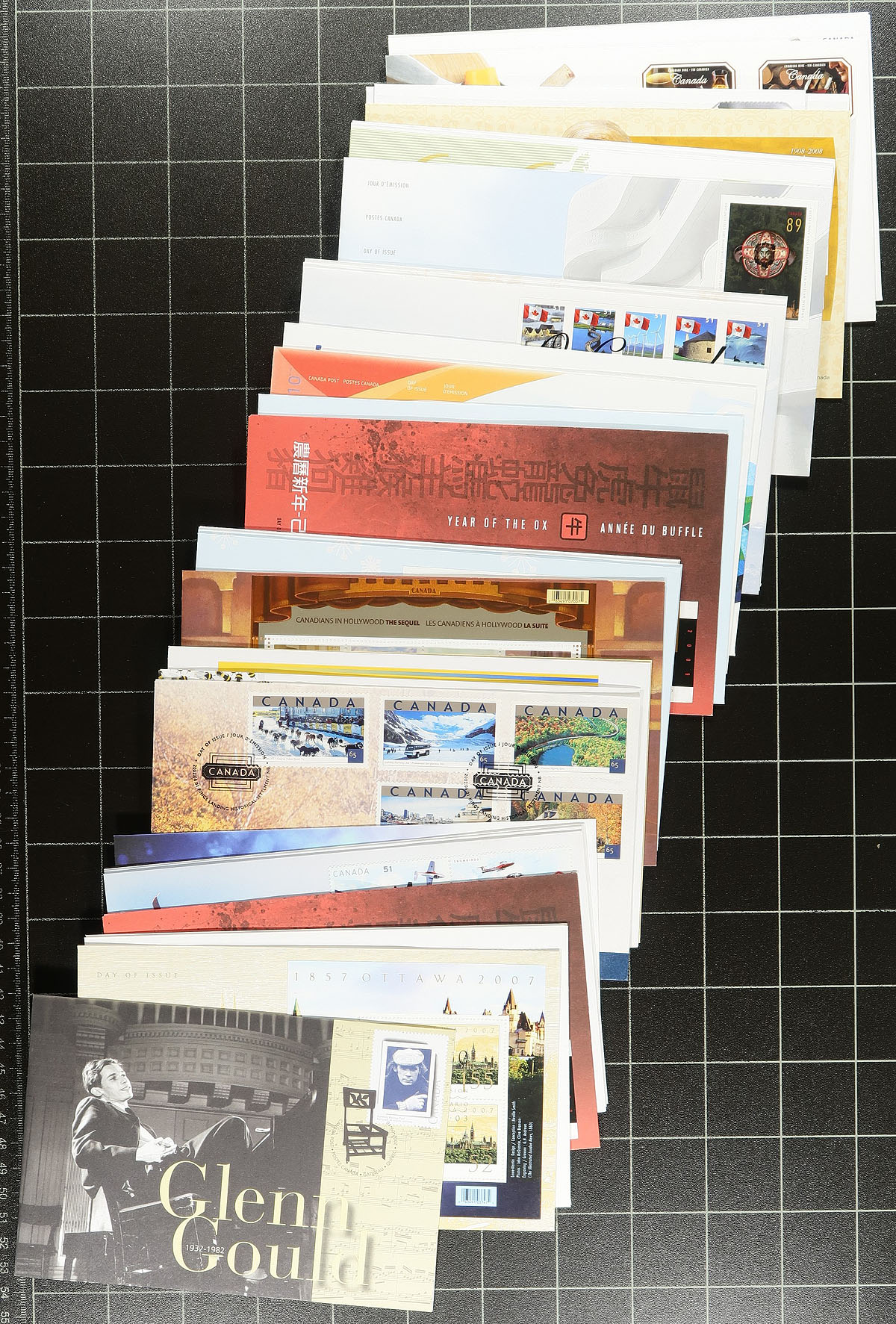 First Day Covers. Group of roughly 350 Canada first day covers, 1995-2010, with singles, sets, souvenir sheets, and plate block frankings. A nice clean group with several colorful cachets. Duplication up to 3 for a few issues. Estimate =