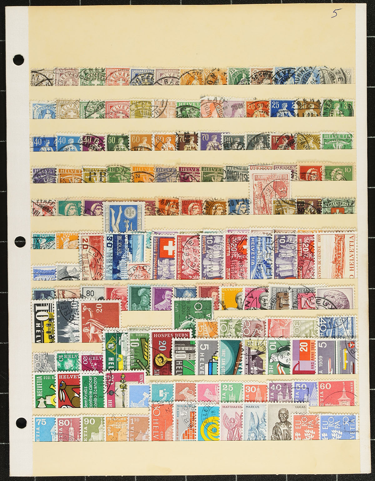 Collection of primarily used Switzerland, 1862-1970, containing roughly 700 stamps, generally well organized on album or in stock pages. The collection contains a good range of values including back of the book issues noting Scott #s 46-47, 54, 56, 59 (c.v. $77.50), 181-185, 206 ($93 total), J1-J9 ($104 total), along with some singles, sets, and partial sets cataloguing $10 to $25 and up each. Duplication up to 2 for a few issues. A clean lot for Switzerland and worldwide collectors. Estimate =