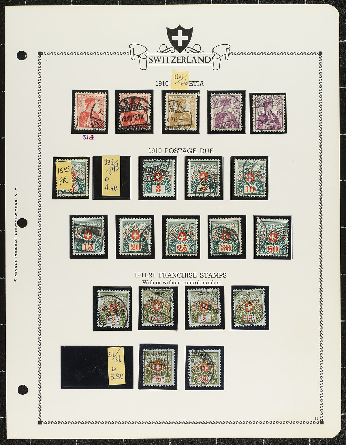 Collection of primarily used Switzerland, 1862-1970, containing roughly 700 stamps, generally well organized on album or in stock pages. The collection contains a good range of values including back of the book issues noting Scott #s 46-47, 54, 56, 59 (c.v. $77.50), 181-185, 206 ($93 total), J1-J9 ($104 total), along with some singles, sets, and partial sets cataloguing $10 to $25 and up each. Duplication up to 2 for a few issues. A clean lot for Switzerland and worldwide collectors. Estimate =
