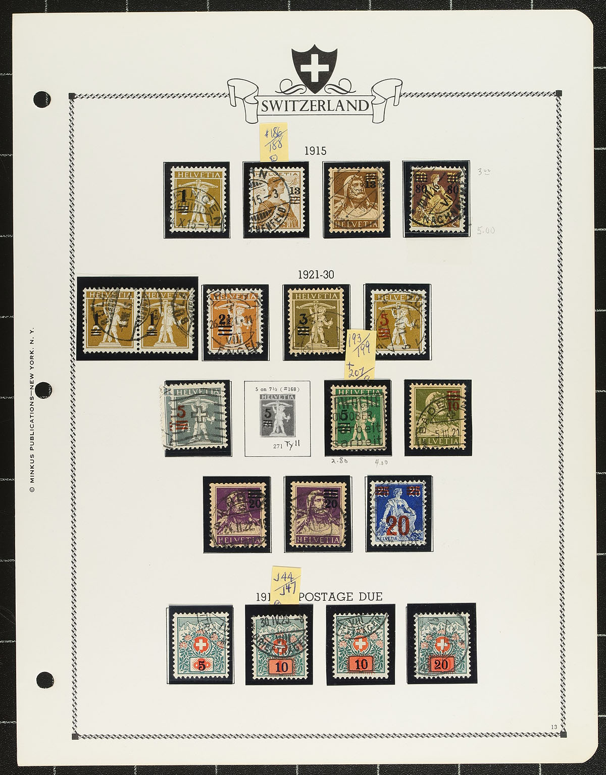 Collection of primarily used Switzerland, 1862-1970, containing roughly 700 stamps, generally well organized on album or in stock pages. The collection contains a good range of values including back of the book issues noting Scott #s 46-47, 54, 56, 59 (c.v. $77.50), 181-185, 206 ($93 total), J1-J9 ($104 total), along with some singles, sets, and partial sets cataloguing $10 to $25 and up each. Duplication up to 2 for a few issues. A clean lot for Switzerland and worldwide collectors. Estimate =