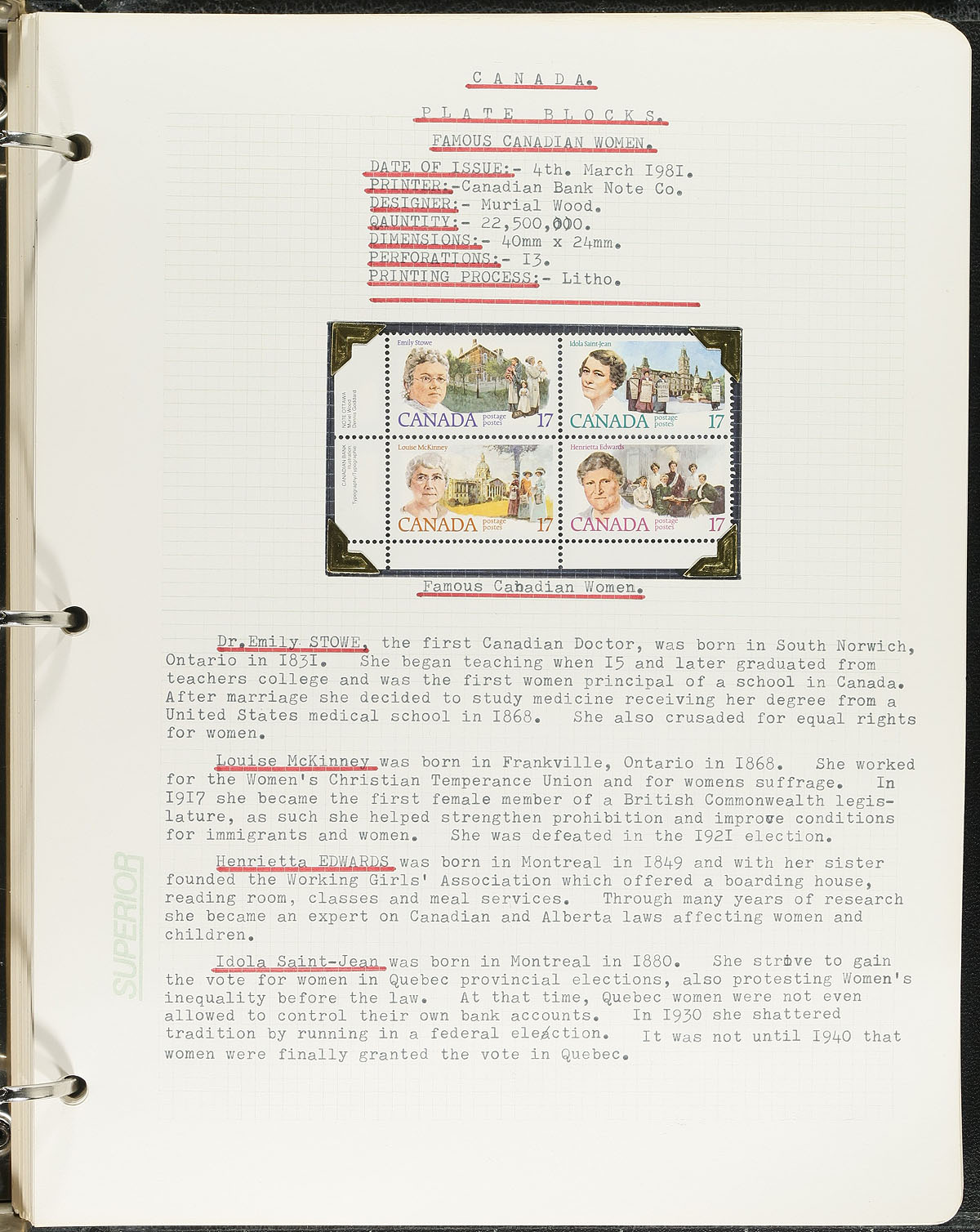 Mint Holding. Collection of mint never hinged Canada plate blocks and booklet panes, 1960s-1982, organized on well described pages. The stamps includes a selection definitive booklet panes (missing the selvedge), from the Wildings to 1982, along with plate blocks from Unitrade #704/906. The material is unhinged, and secured onto pages by the use of photo corners. Unitrade catalogue value for the lot totals $345, with a face value alone totaling $100.00. A very nice organized collection. Estimate =