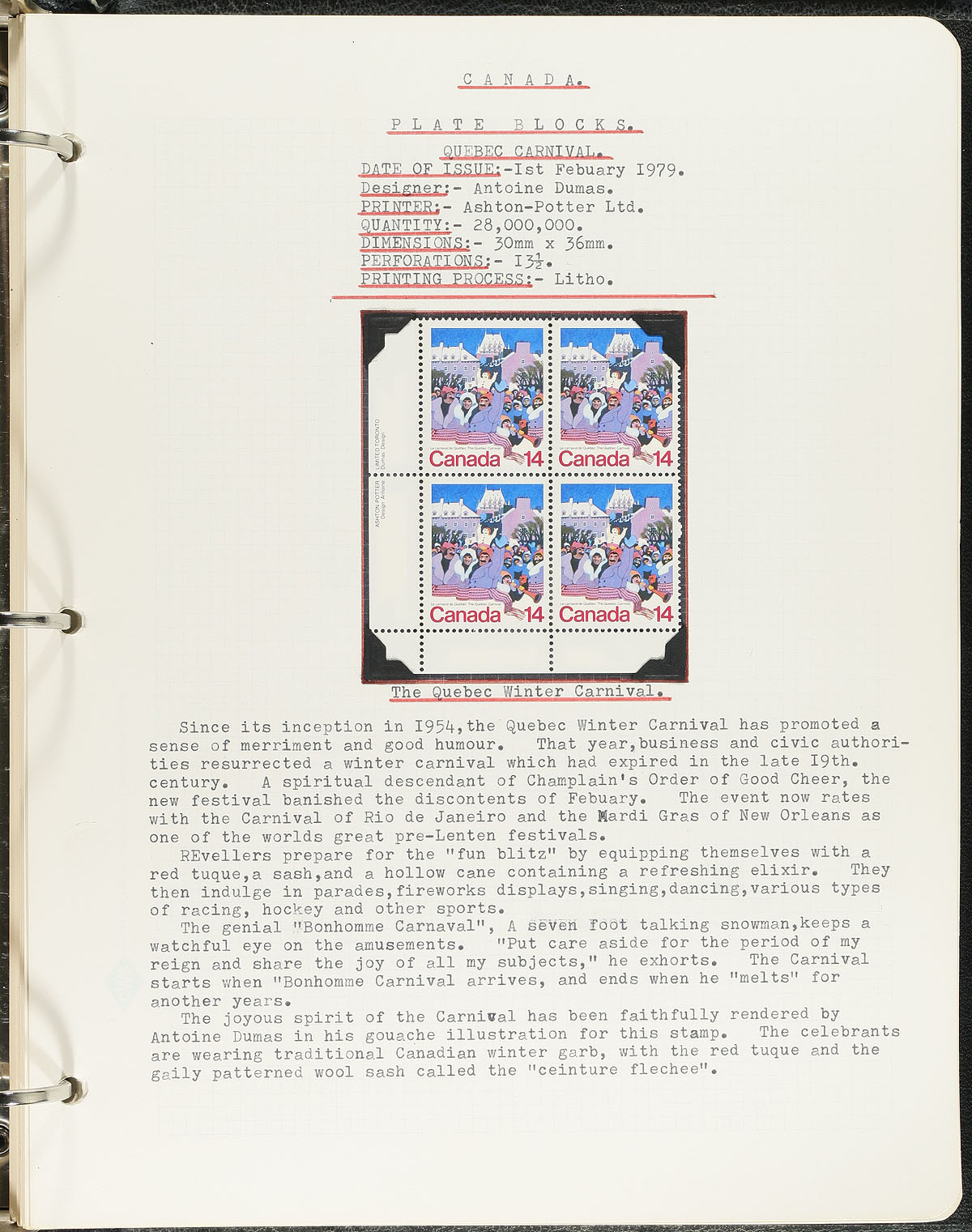 Mint Holding. Collection of mint never hinged Canada plate blocks and booklet panes, 1960s-1982, organized on well described pages. The stamps includes a selection definitive booklet panes (missing the selvedge), from the Wildings to 1982, along with plate blocks from Unitrade #704/906. The material is unhinged, and secured onto pages by the use of photo corners. Unitrade catalogue value for the lot totals $345, with a face value alone totaling $100.00. A very nice organized collection. Estimate =