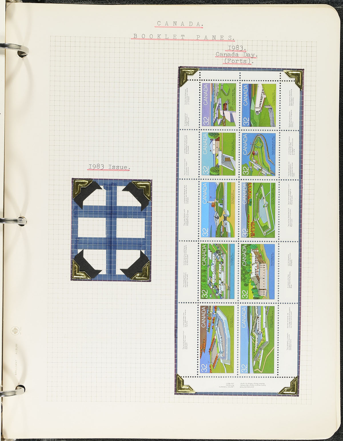 Mint Holding. Collection of mint never hinged Canada plate blocks and booklet panes, 1960s-1982, organized on well described pages. The stamps includes a selection definitive booklet panes (missing the selvedge), from the Wildings to 1982, along with plate blocks from Unitrade #704/906. The material is unhinged, and secured onto pages by the use of photo corners. Unitrade catalogue value for the lot totals $345, with a face value alone totaling $100.00. A very nice organized collection. Estimate =