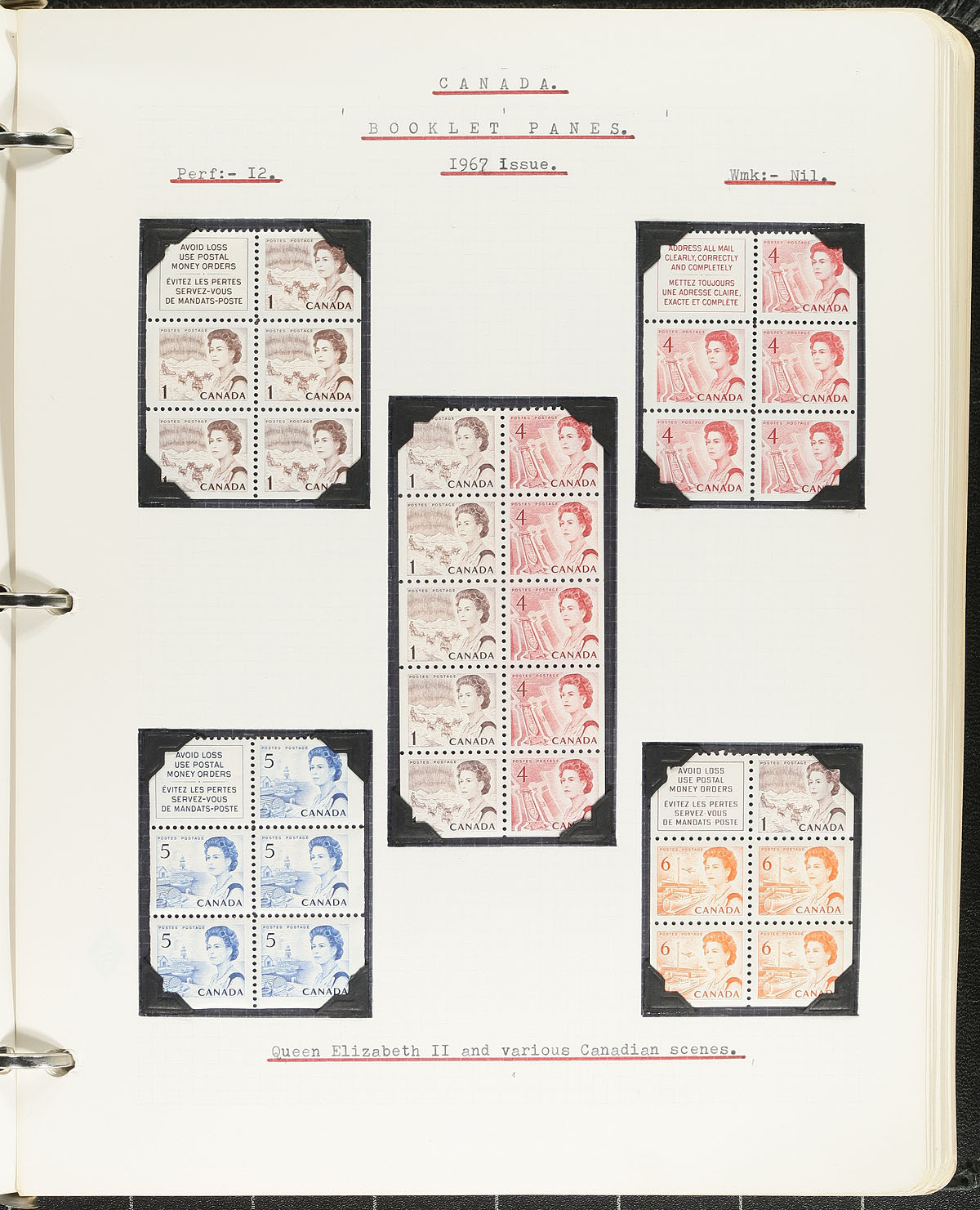 Mint Holding. Collection of mint never hinged Canada plate blocks and booklet panes, 1960s-1982, organized on well described pages. The stamps includes a selection definitive booklet panes (missing the selvedge), from the Wildings to 1982, along with plate blocks from Unitrade #704/906. The material is unhinged, and secured onto pages by the use of photo corners. Unitrade catalogue value for the lot totals $345, with a face value alone totaling $100.00. A very nice organized collection. Estimate =
